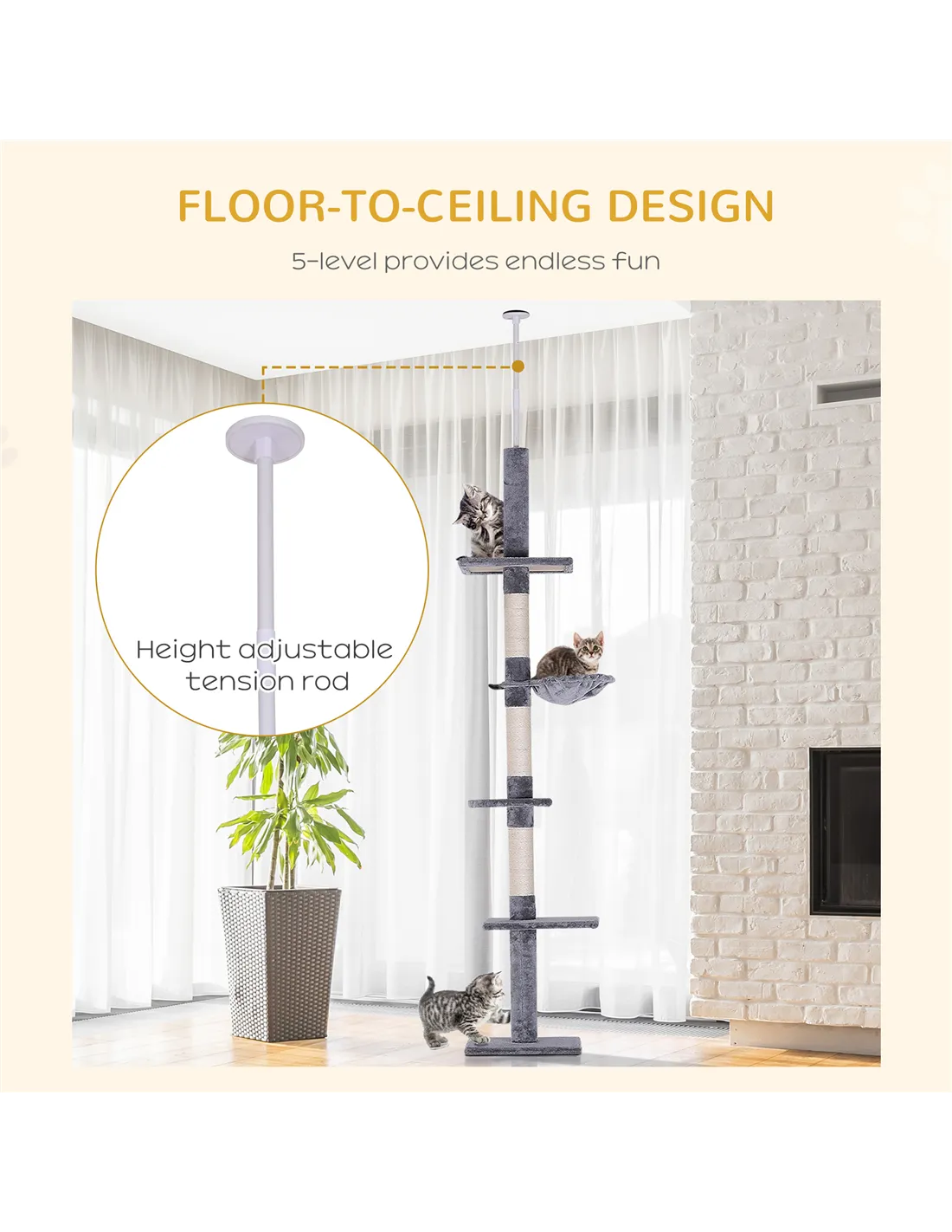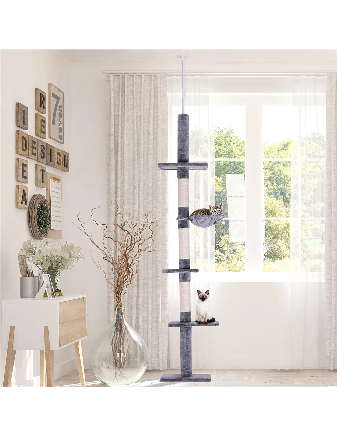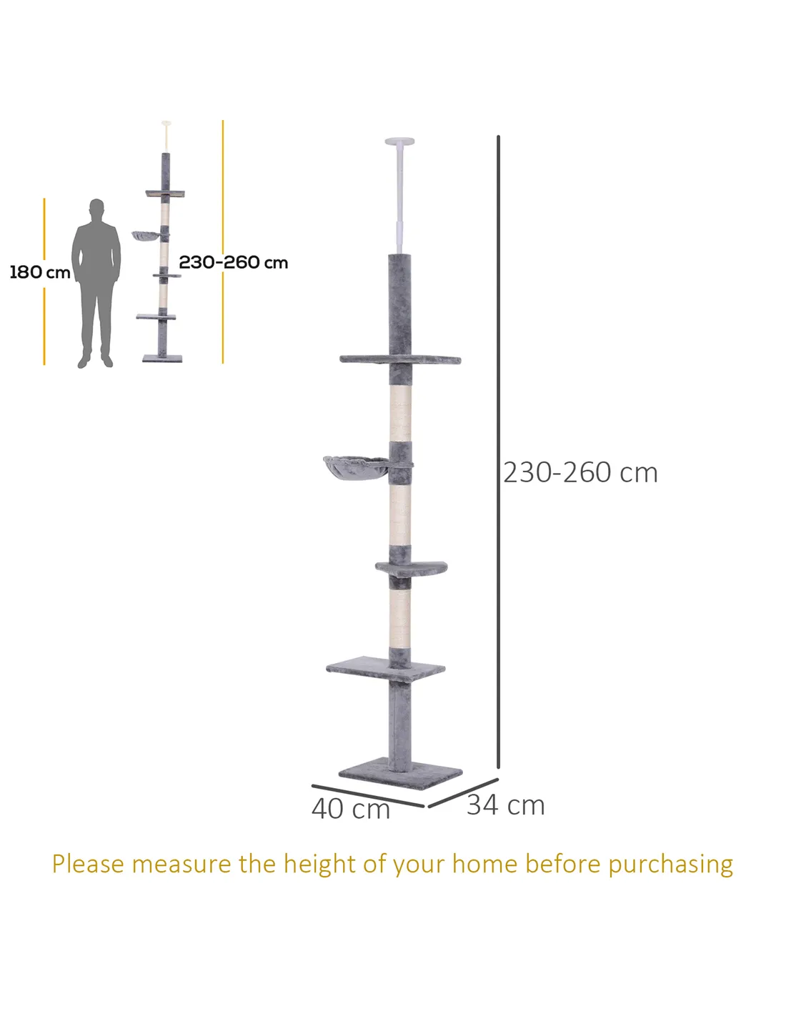 Absolutely. The tower’s height is adjustable from 230cm to 260cm, allowing it to fit securely between floor and ceiling. - What materials are used in the construction?