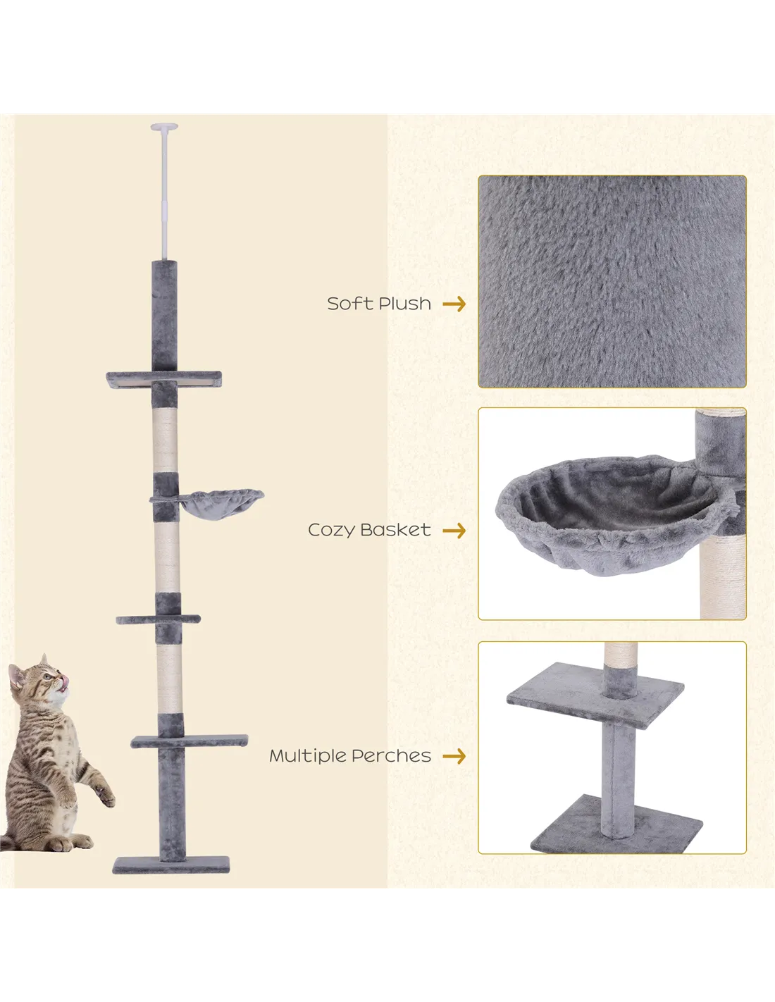 Transform your home into a feline paradise with the PawHut cat play tower, designed for the ultimate comfort and entertainment of your beloved cats. This towering structure, stretching from floor to ceiling, offers five tiers for climbing, lounging, and exploring, ensuring your cats have endless fun while staying active. The integrated scratching post can protect your furniture. Height adjusts from 230cm to 260cm, it seamlessly fits any room, providing a cozy haven for your furry companions.