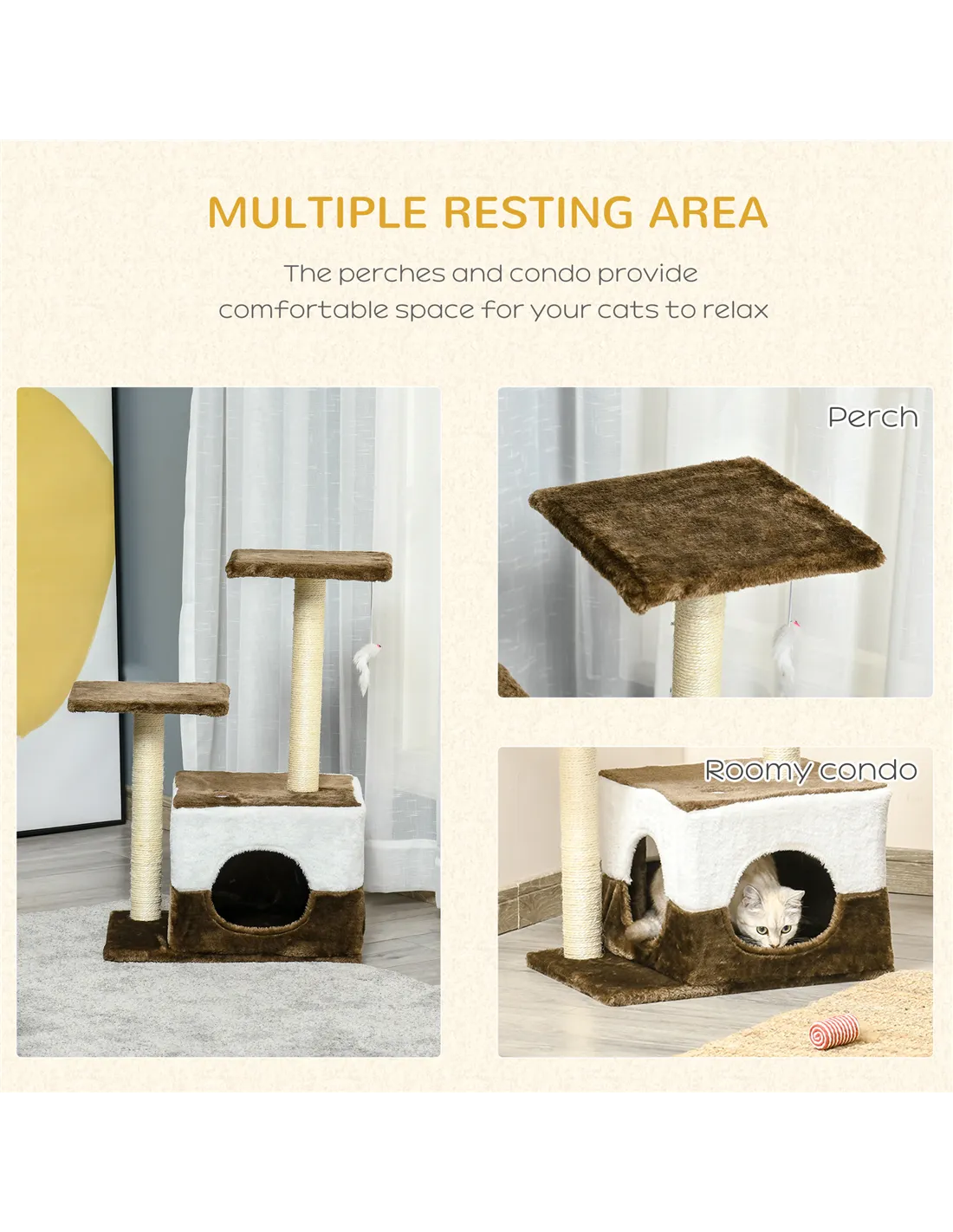 The PawHut cat tree tower is an ideal addition to any indoor space, perfectly suited for homes with one or more cats under 4kg. Place it in a quiet corner of your living room or bedroom to create a dedicated play and rest area for your feline friends. The sisal-wrapped scratching posts help protect your furniture by satisfying your cat’s natural clawing instincts, while the soft plush-covered condo and perches offer cosy spots for napping or observing their surroundings. The interactive hanging mouse toy encourages independent play, keeping your pet entertained when you’re away. Its compact dimensions (45 x 33 x 70 cm) make it suitable for flats or smaller homes, blending seamlessly with modern interiors thanks to its neutral brown colour.