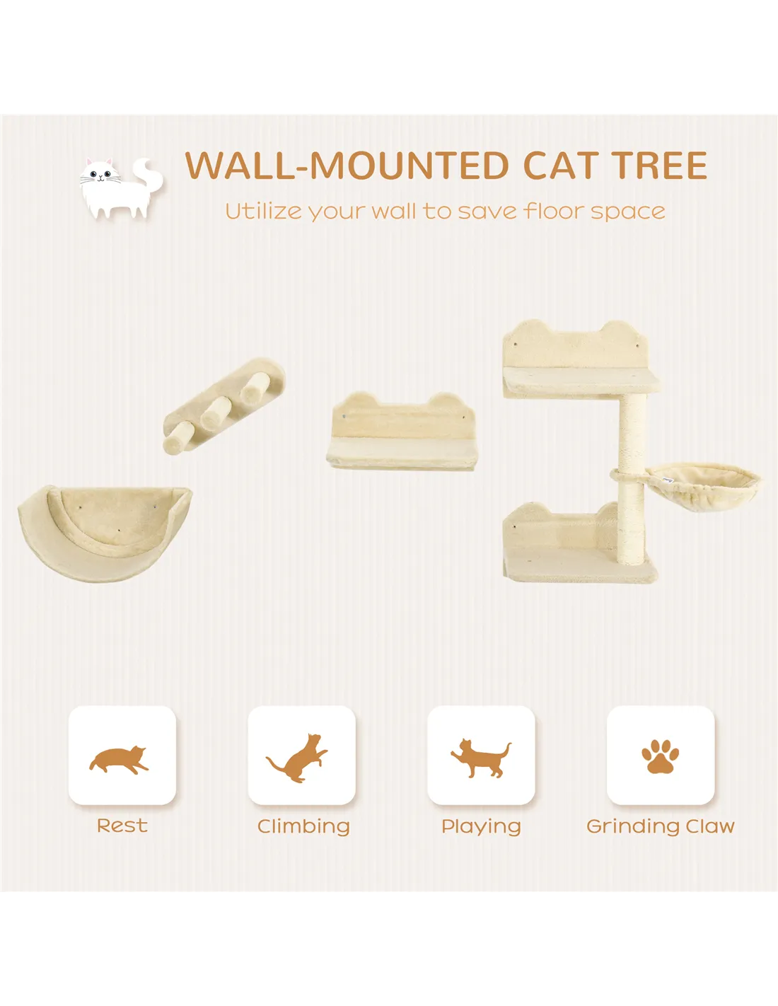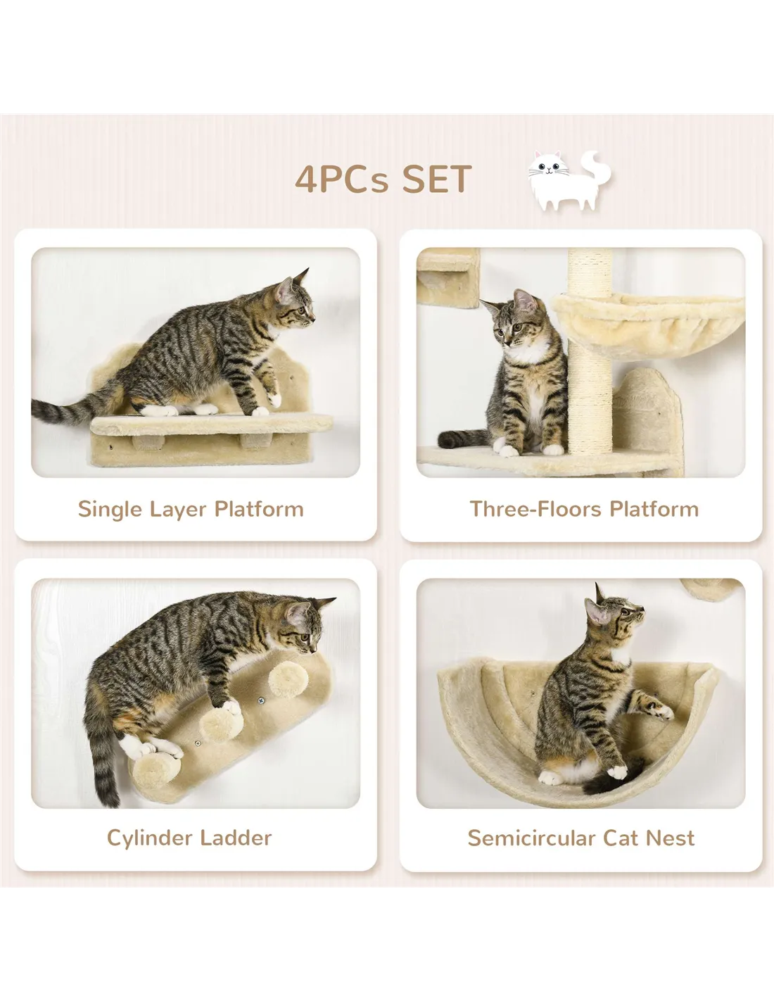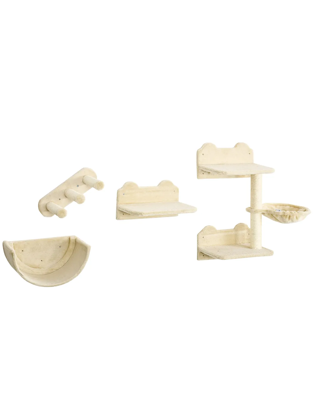 PawHut 4PCs Wall-Mounted Cat Shelves w/ Scratching Post, Hammock, Nest - Beige