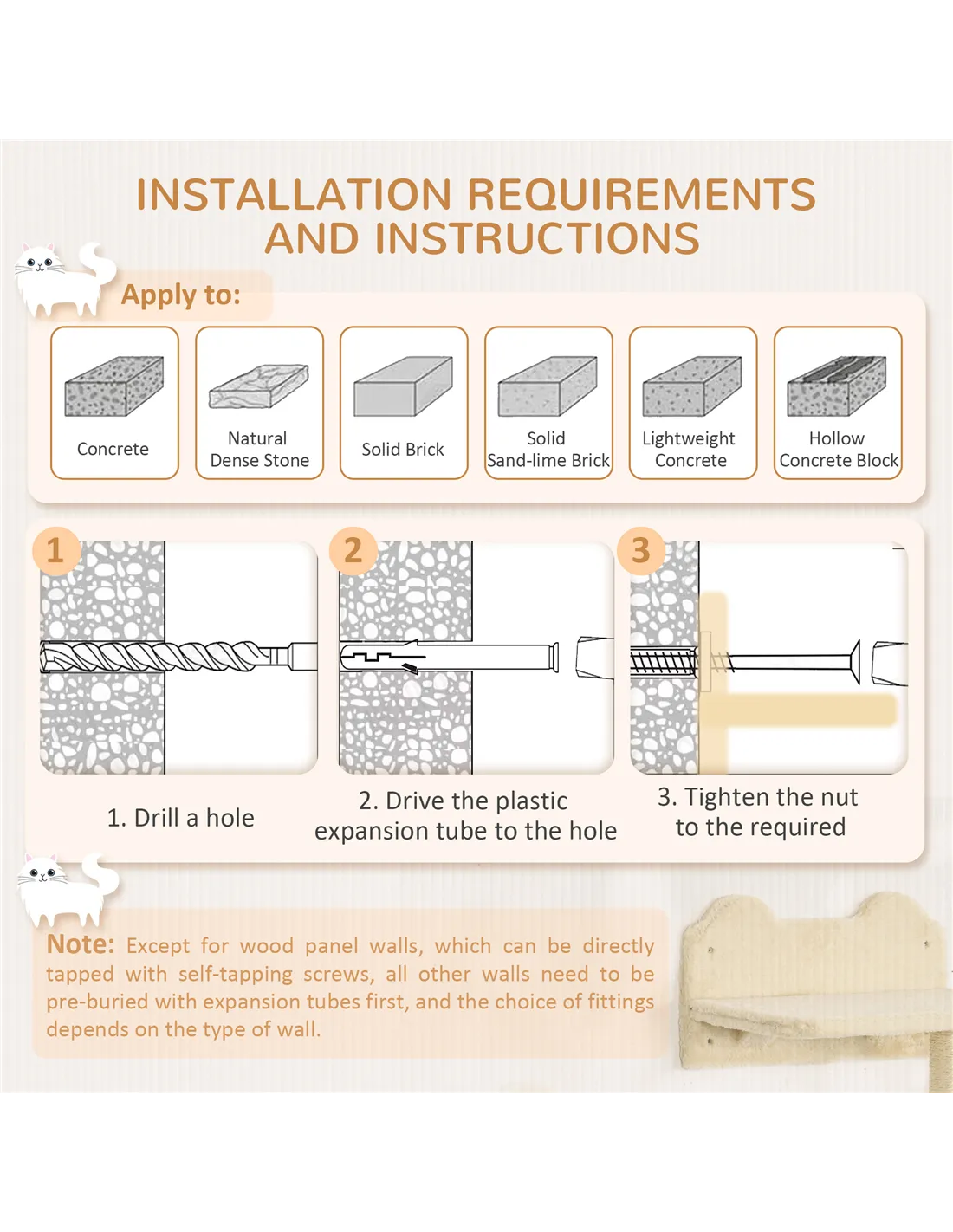 - Note: All walls must be pre-drilled with expansion tubes, except for plant walls, were self-tapping screws can be used directly into the wall