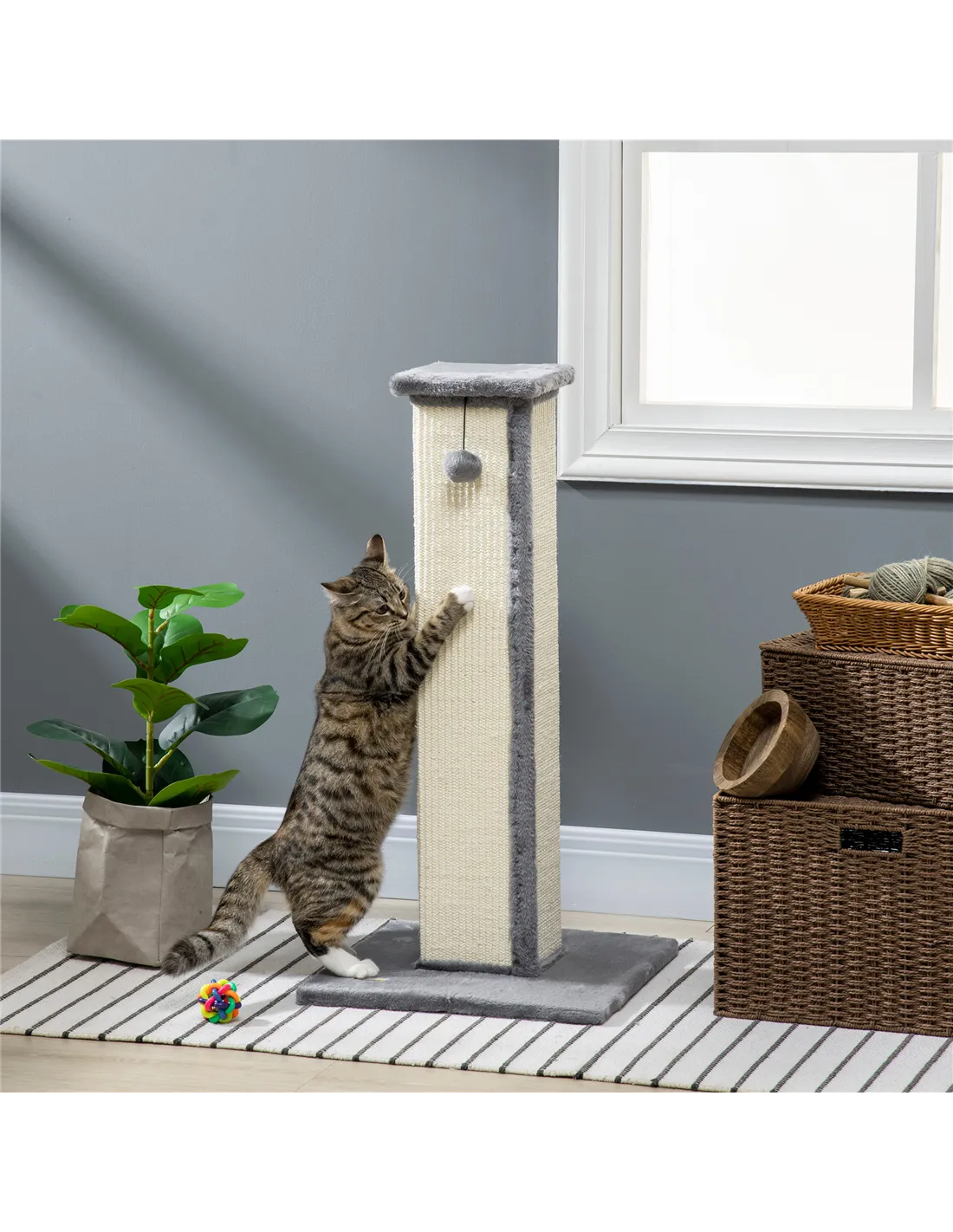 - Sisal scratching post lets cats dig and claw, deterring them from using furniture