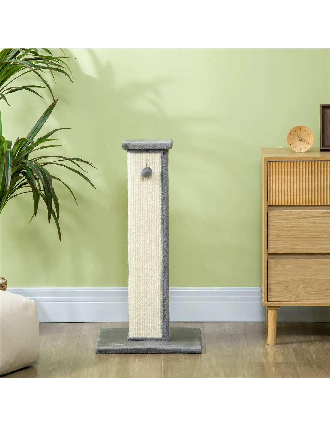 Enhance your home's aesthetic while delighting your cats with the PawHut cat scratching post. This stylish piece, covered in natural sisal rope, not only saves your furniture but also enhances your decor. The playful toy ball atop captures your cat's curiosity, while the plush-covered base and pole offer a cozy resting spot. Crafted from durable particle board, it ensures stability and longevity. Ideal for those valuing beauty and function in pet furniture, making each day special for your pet.