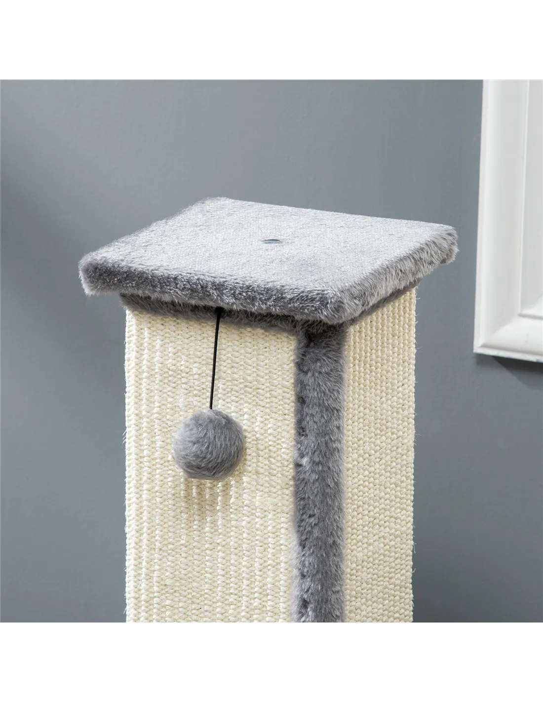 - The soft plush covering on the base and post creates a cosy nook where your cat can rest after playtime, blending seamlessly with modern home décor thanks to its neutral grey and cream tones.