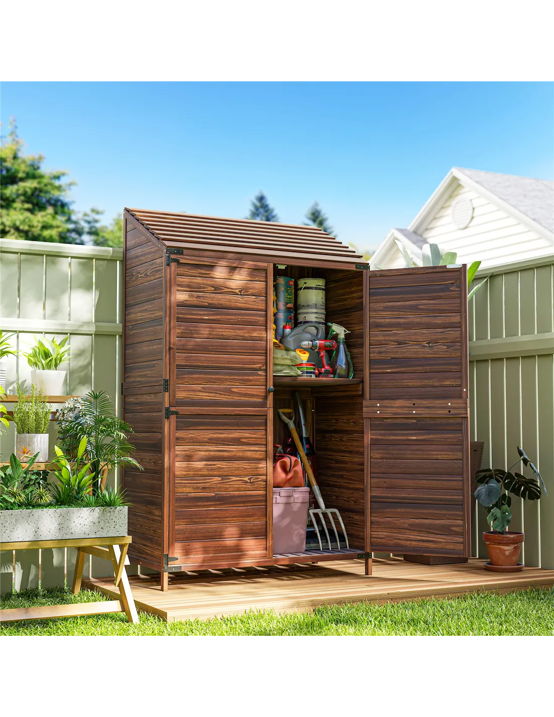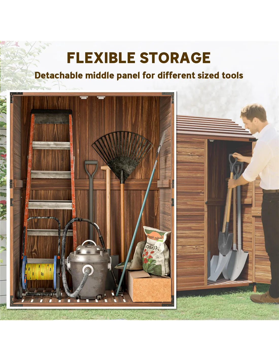 - Two-tier inner storage: plenty of room for garden tools, equipment, cleaning supplies, pots and more