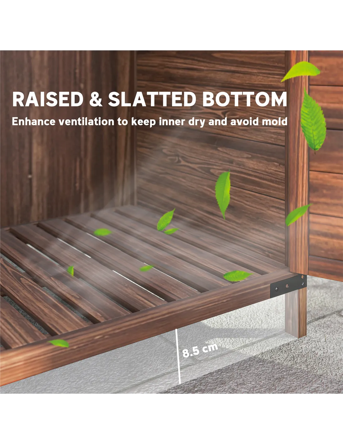 - Slatted bottom allows fresh air inside. Keeps inside aerated