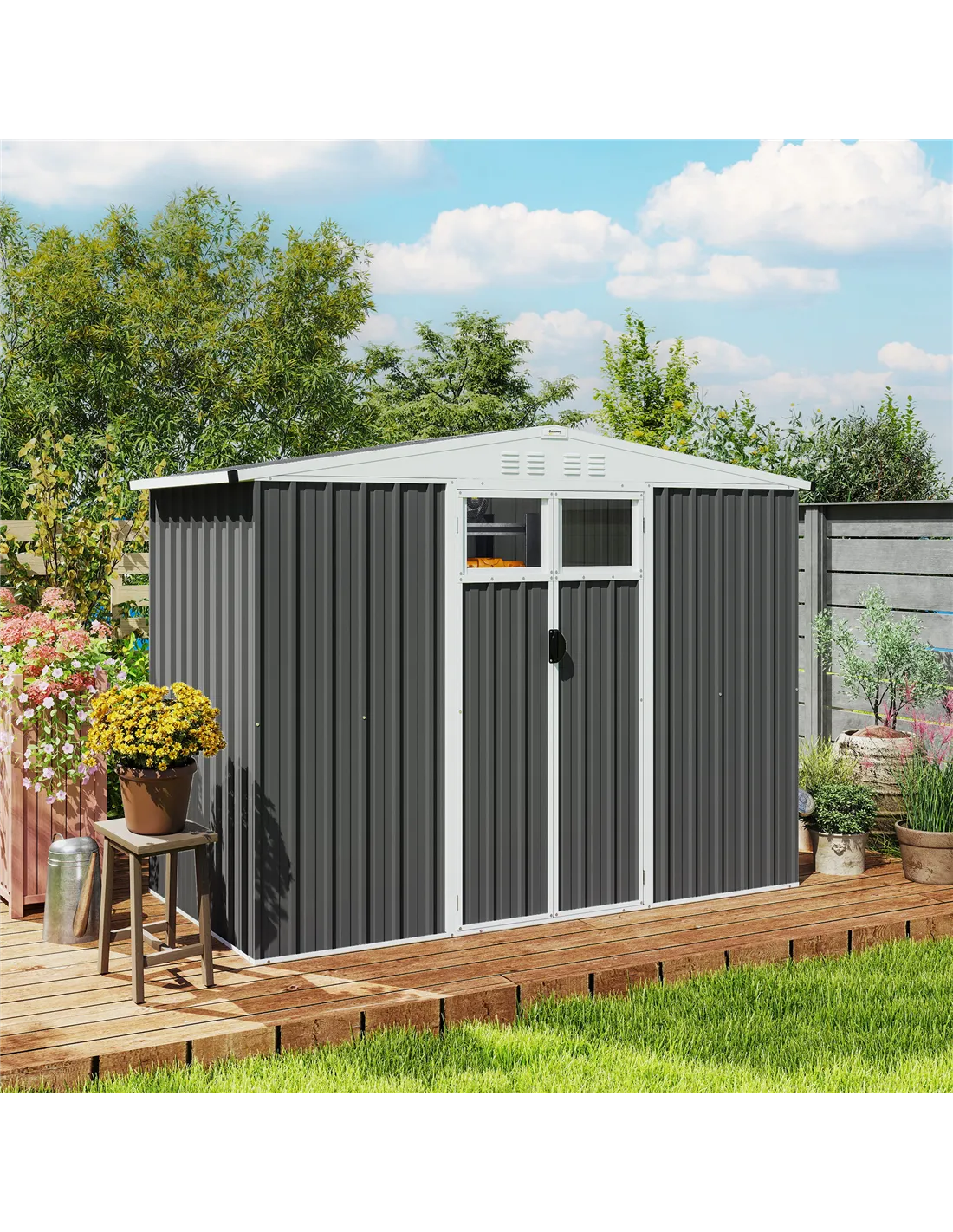 Discover the charm of tidiness with the Outsunny metal garden shed. Spaciously designed to house everything from bikes to garden tools, this garden shed features double doors for easy access and secure storage. Enjoy natural light with two transparent windows and keep the air fresh with four well-placed vents. Made from anti-UV, rust-resistant galvanised steel, it's the stylish haven for all your outdoor essentials.