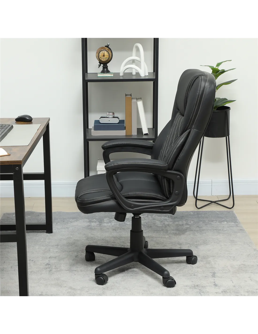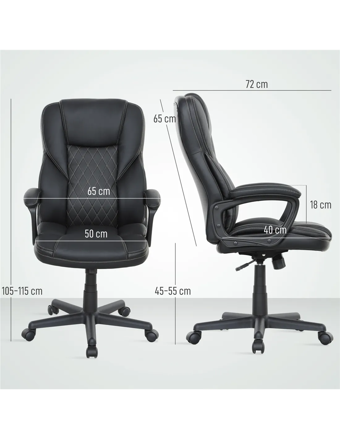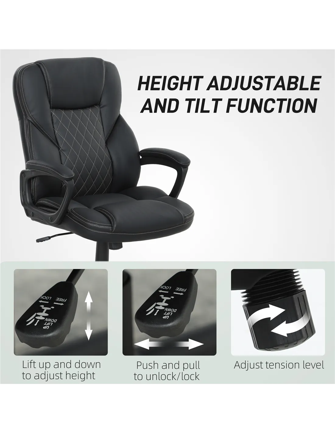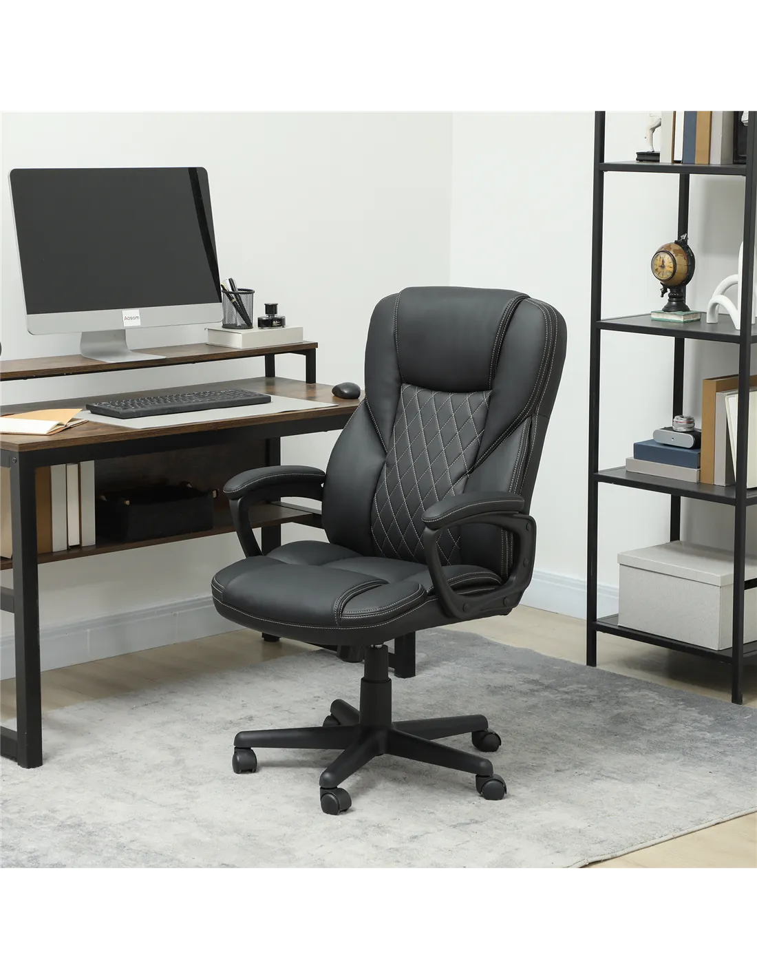 The HOMCOM executive office chair is an excellent addition to any home workspace, offering both style and comfort. Ideal for remote working, study areas, or creative studios, its adjustable height and tilt function allow you to tailor your seating position for long hours of productivity or relaxation. Thanks to its sleek black PU leather finish and modern diamond stitching, it complements contemporary interiors effortlessly. Place it by your desk for efficient work sessions or use it in a reading nook to enjoy a comfortable swivel and recline experience. Its smooth 360° rotation and sturdy wheels make moving around your home office seamless and convenient.