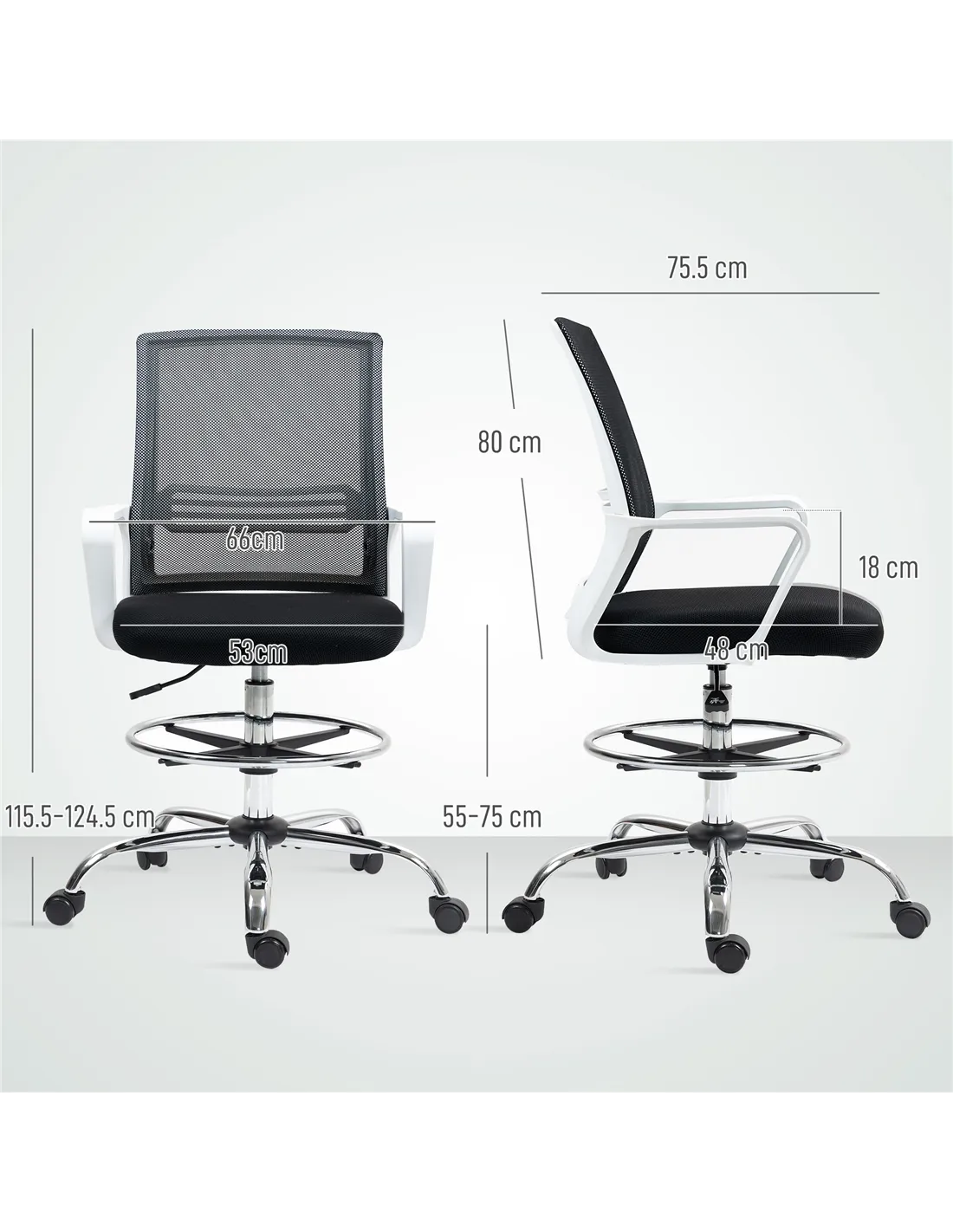 The HOMCOM draughtsman chair is an excellent addition to any creative or professional environment. Ideal for architects, designers, or workshop users, its adjustable height and supportive foot ring make it perfect for drafting tables or standing desks. Thanks to its breathable mesh back and ergonomic lumbar support, it ensures comfort during long hours of work or study. It also serves well as a perching stool in studios or retail spaces, providing a versatile seating solution that adapts to various tasks and settings.