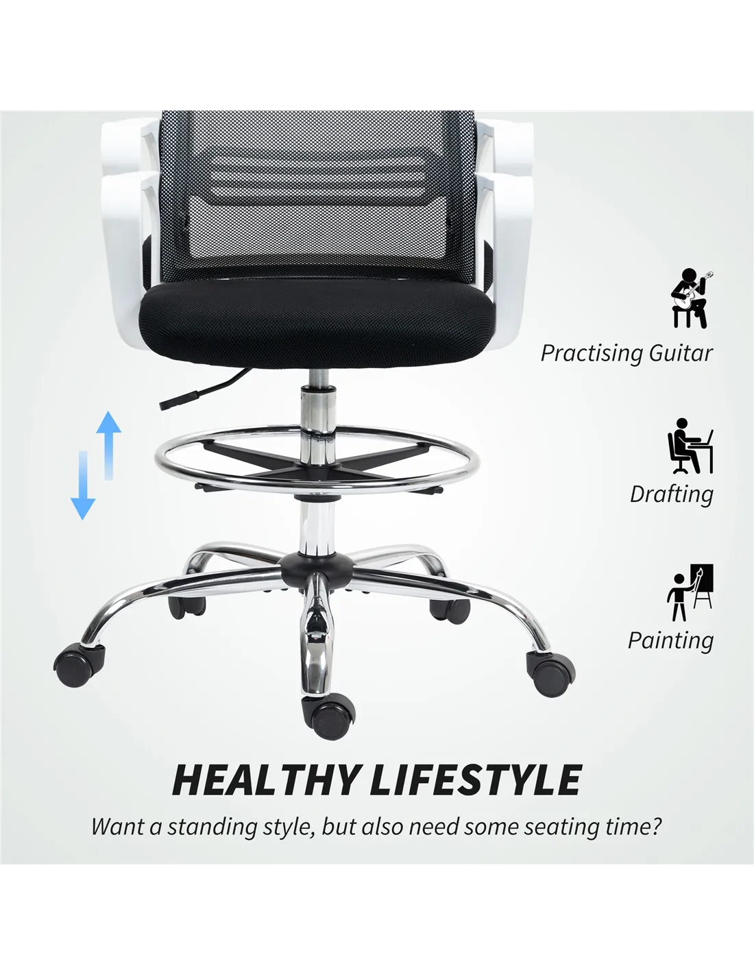 - Adjustable seat height and foot ring height, enhance comfort and posture