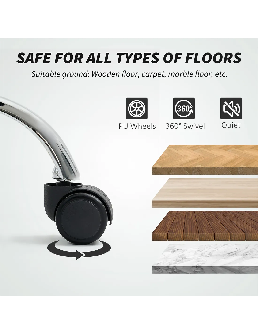 - PU wheels glide smoothly on different flooring surfaces