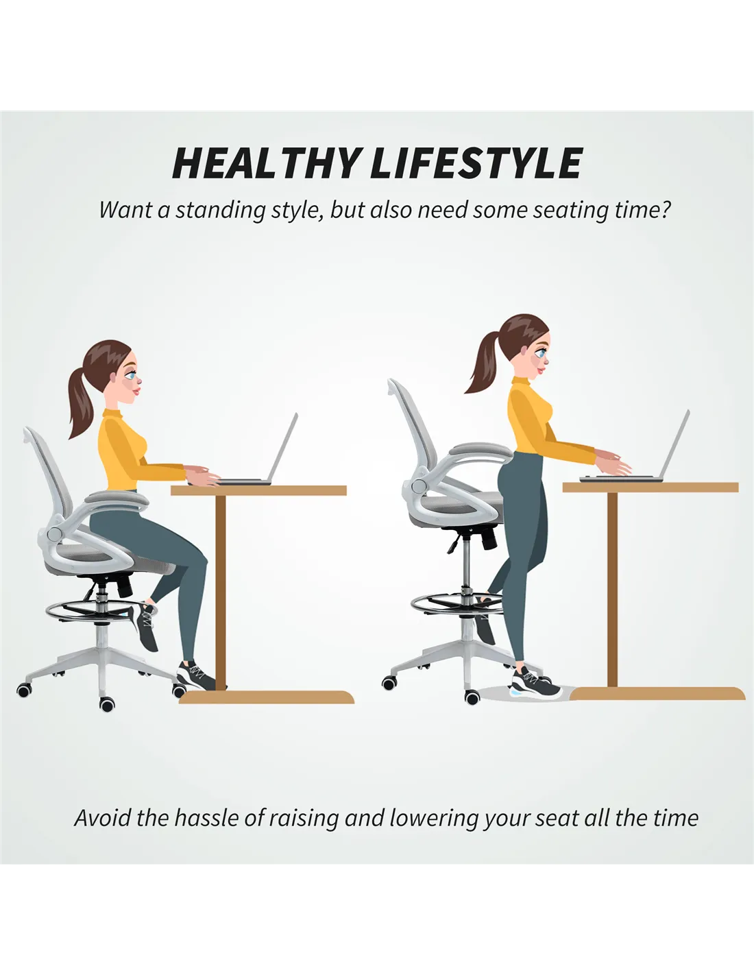 Vinsetto Drafting Chair with Flip-up Armrest, Mesh Office Stool with Foot Ring, 360 Degree Swivel Height Adjustable Chair for Standing Desk, Light Grey