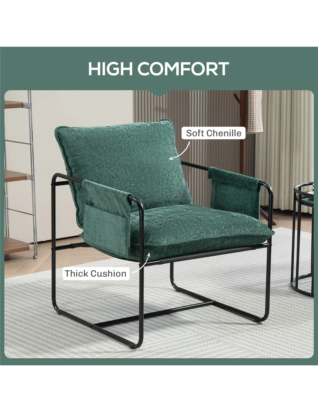 Simple style meets soft comfort with this HOMCOM accent chair. The powder coated steel frame ensures a tough, supportive core, fitted with a padded seat and back cushion for comfort; the soft chenille covers are removable and washable for hygiene. Complete with storage pockets on each arm for keeping magazines, remotes and similar within easy reach.