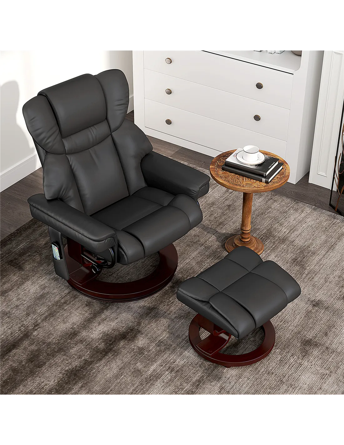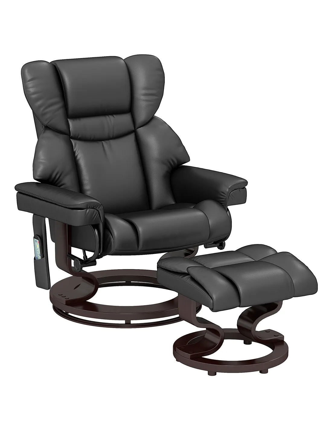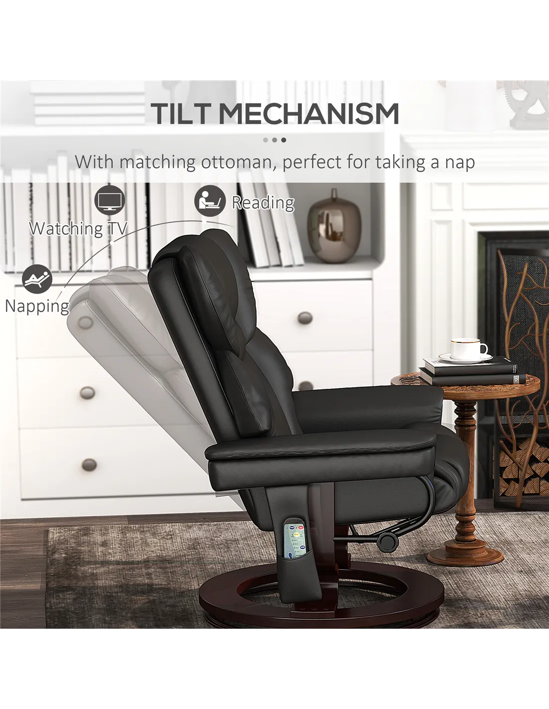 The HOMCOM massage recliner with footstool is a versatile addition to any home, ideal for creating a relaxing corner in your living room or bedroom. Its adjustable backrest and 360° swivel function allow you to find the perfect position for reading, watching TV, or simply unwinding after a long day. Thanks to its compact footprint and elegant black PU upholstery, it fits seamlessly into modern interiors, while the side pockets provide handy storage for remotes, magazines, or mobile devices. Whether used as a cosy reading chair or a massage seat to relieve tension, this recliner enhances comfort and style in your personal space.