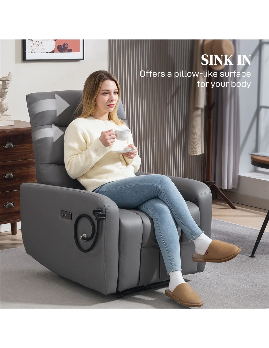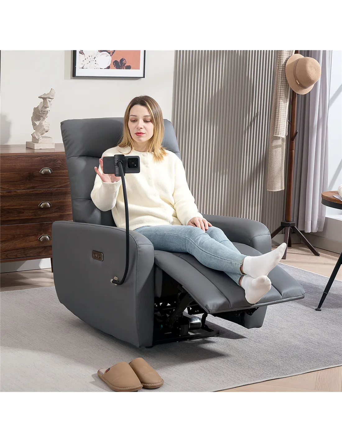 - Ideal for a living room corner where relaxation and convenience meet, with built-in USB and Type-C charging ports to keep your devices powered.