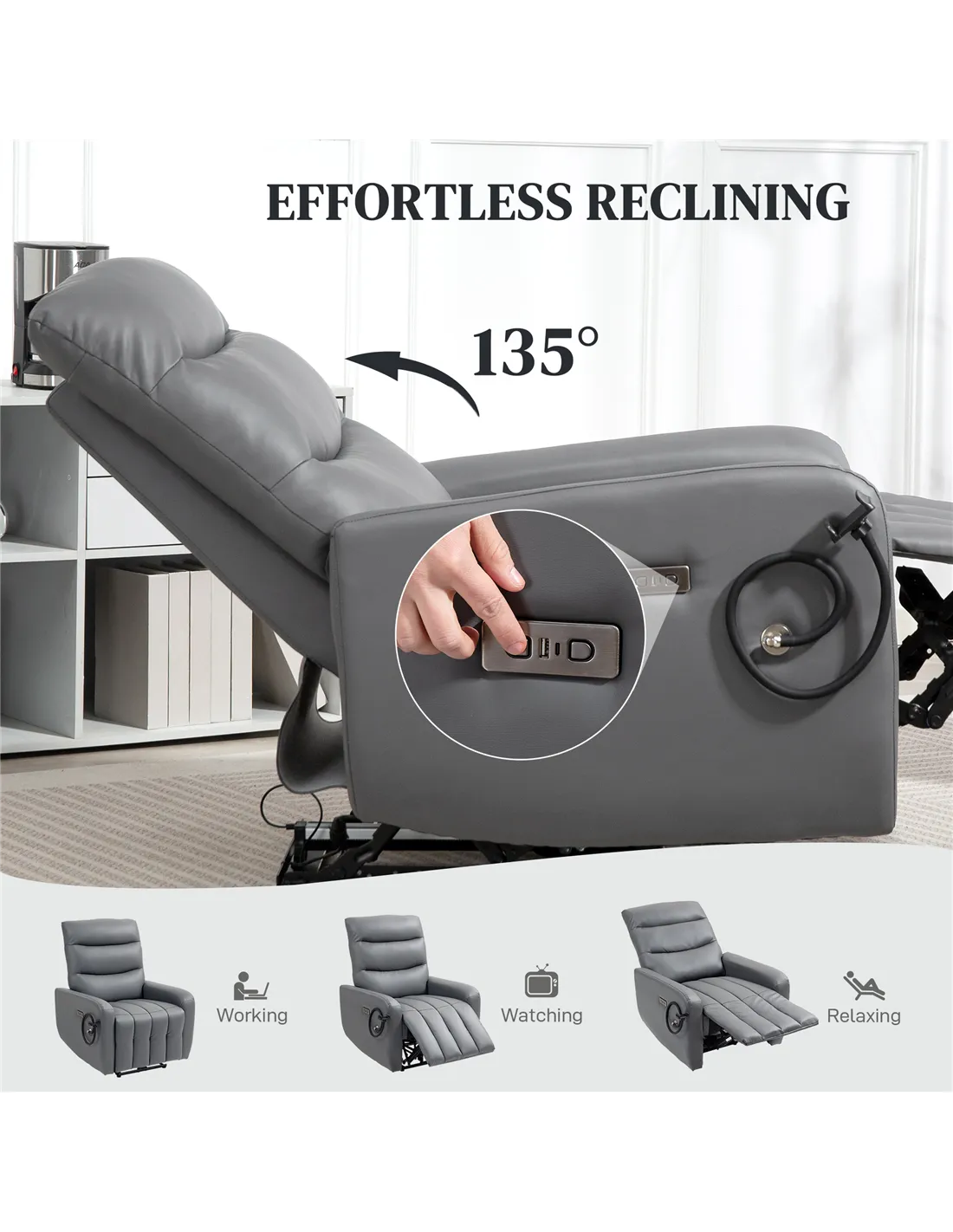HOMCOM Electric Recliner Armchair with USB + Type C Charge Port, Phone Holder, PU Leather Reclining Chair with Adjustable Leg Rest, Recliner Chair for Home Living Room Theater, Grey