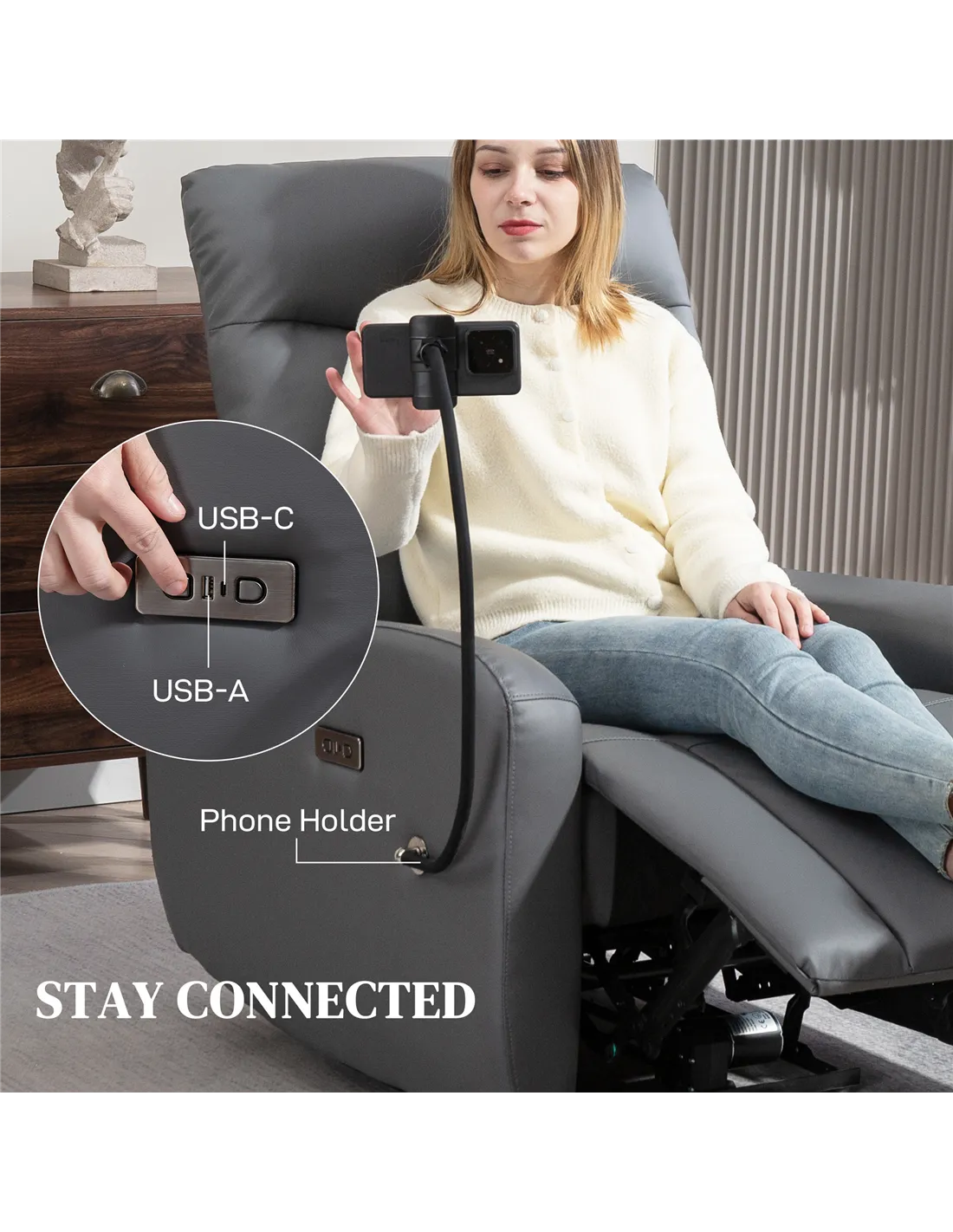 The recliner features both USB and USB-C ports, compatible with a wide range of smartphones, tablets, and other electronic devices for convenient charging.