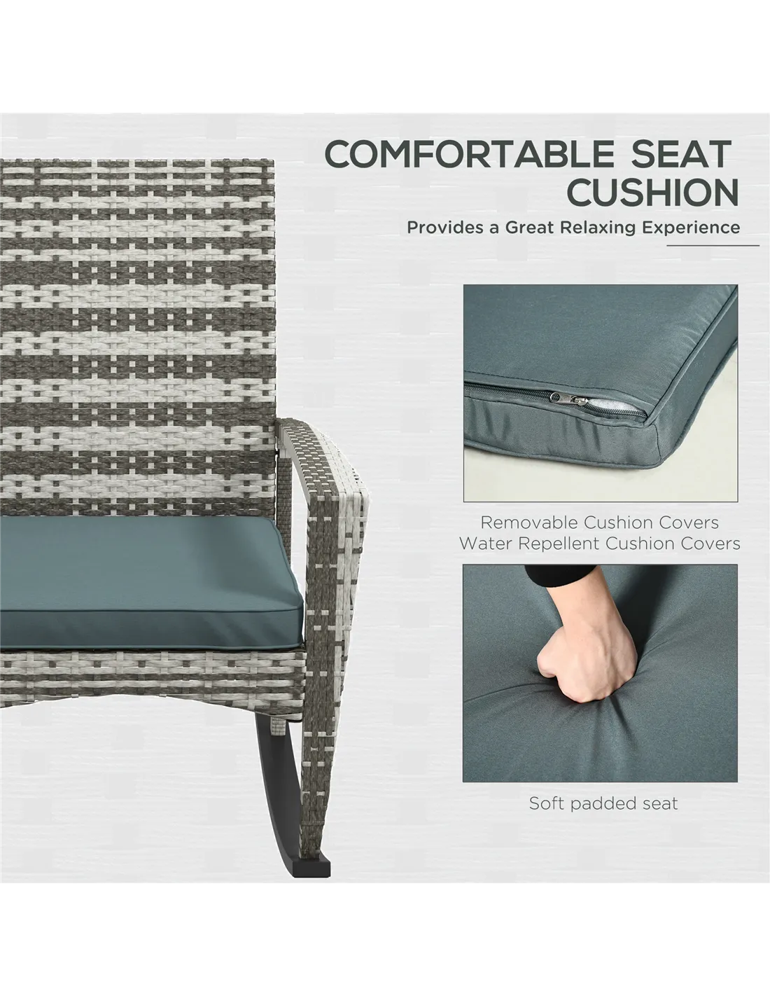 Outsunny PE Rattan Garden Rocking Chair, Outdoor Rocking with Cushion, 160 KG Capacity Wicker Garden Armchair Rocker with Metal Frame for Patio, Porch, Balcony, Light Grey
