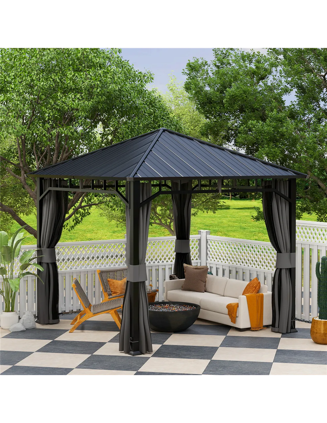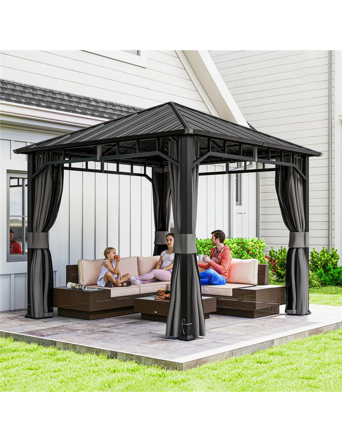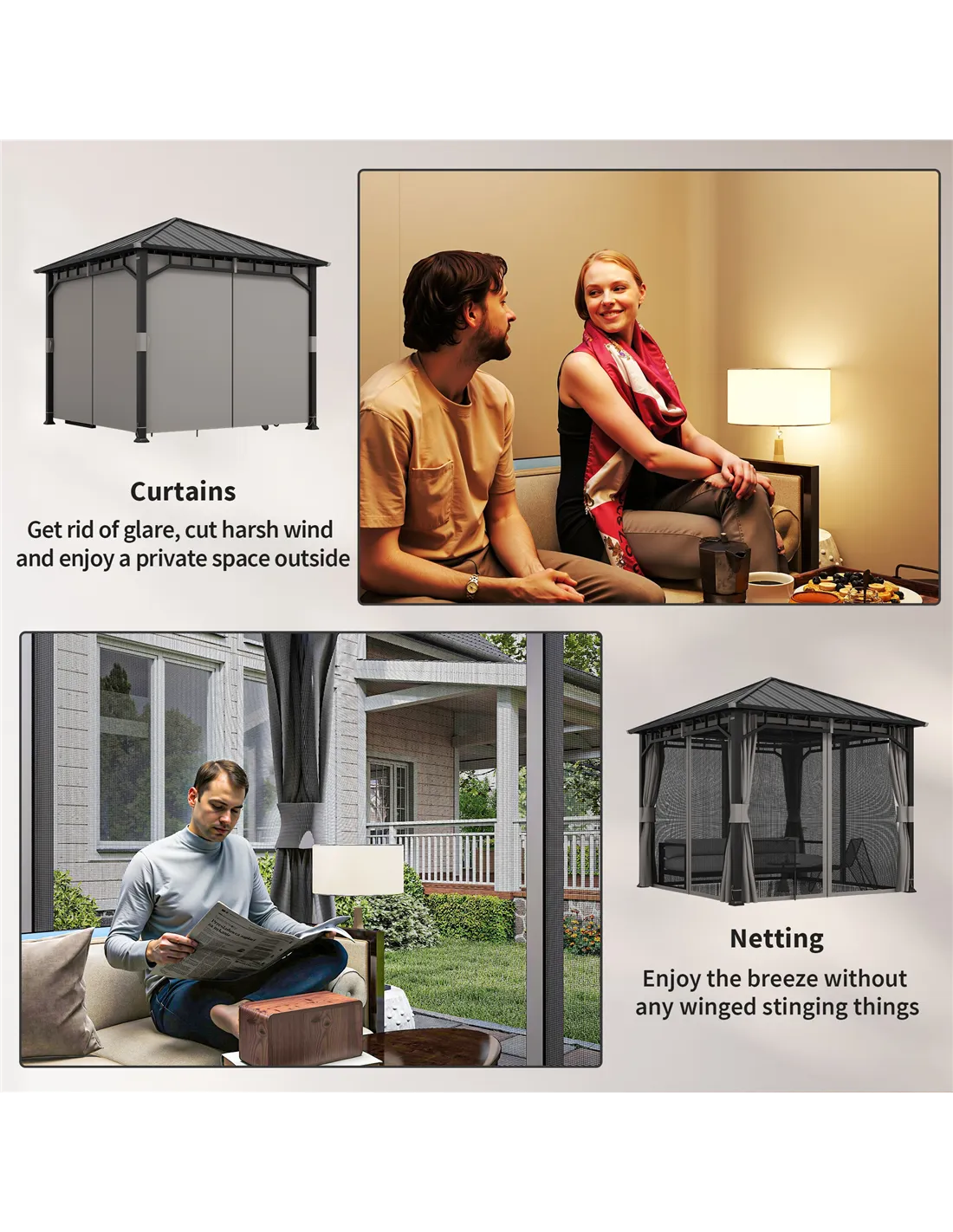 - Transform into a cosy outdoor workspace or reading nook, benefiting from the gazebo’s insect netting and privacy curtains.