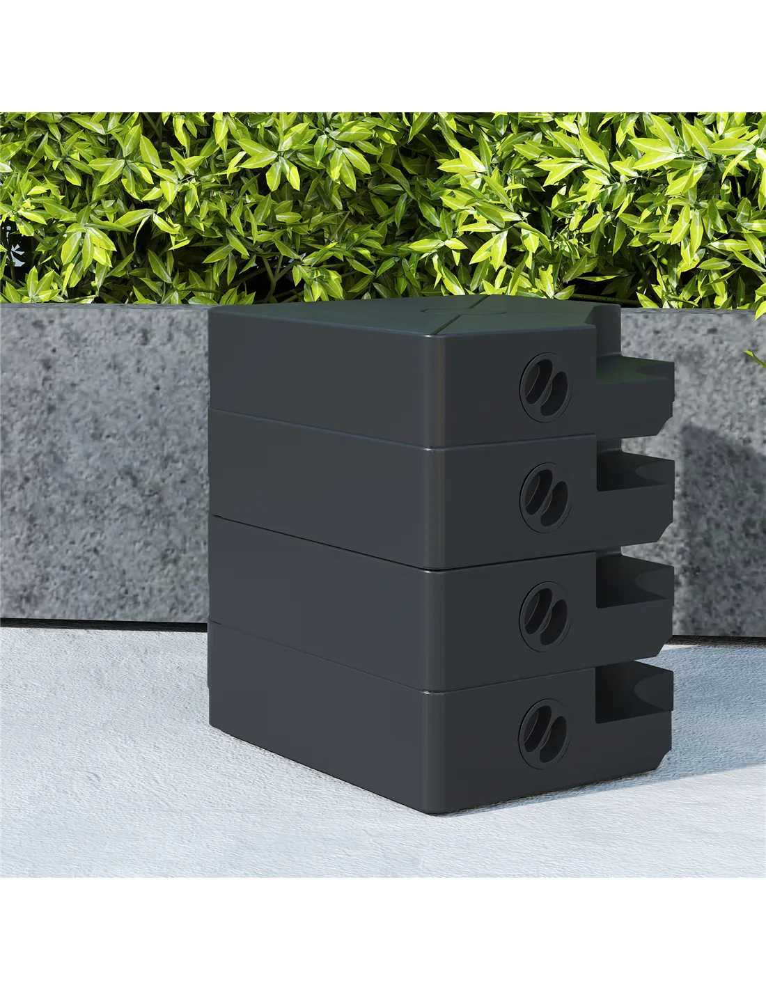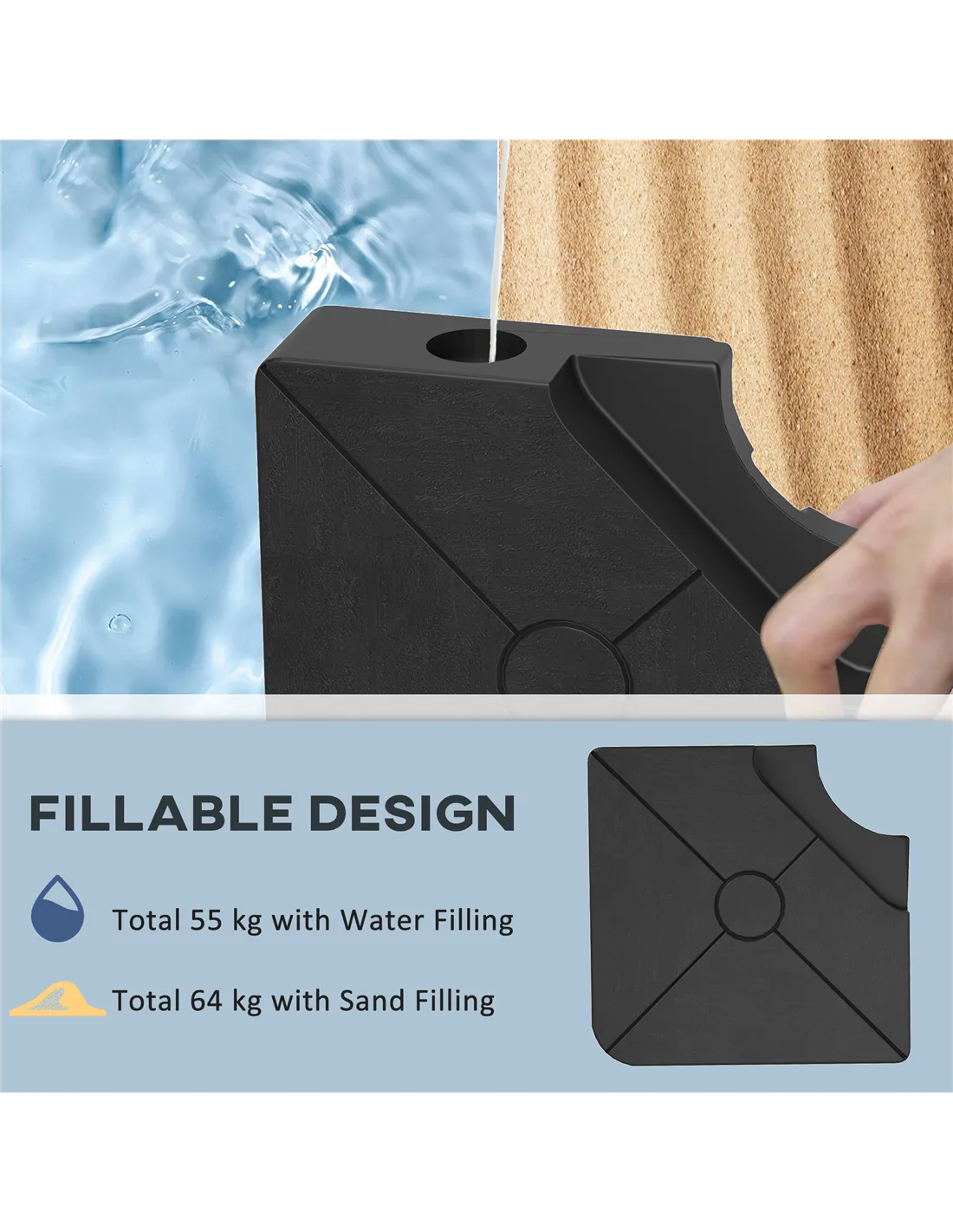 Ensure Outsunny cantilever parasols stand firmly in place, day and evening long: get our cantilever parasol base weights. They are made from HDPE plastic, tough enough for outdoor use. Each piece feature a filling port and screw cap so that you can fill it with water or sand easily. When empty, these parasol bases are light and convenient to carry around. Create your own oasis under the shade with a little help from us.