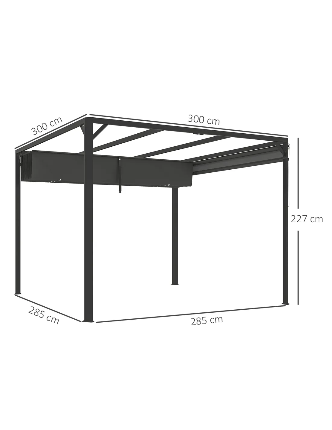 Sun and weather shade you way with this Outsunny 3 x 3 m retractable pergola. It has both a retractable canopy and side - set both pieces to a position you want, to protect against sun, wind and rain as needed; as well as privacy. The aluminium frame is strong and suitable for outdoor use, complete with ground stakes and expansion screws to secure to the ground.