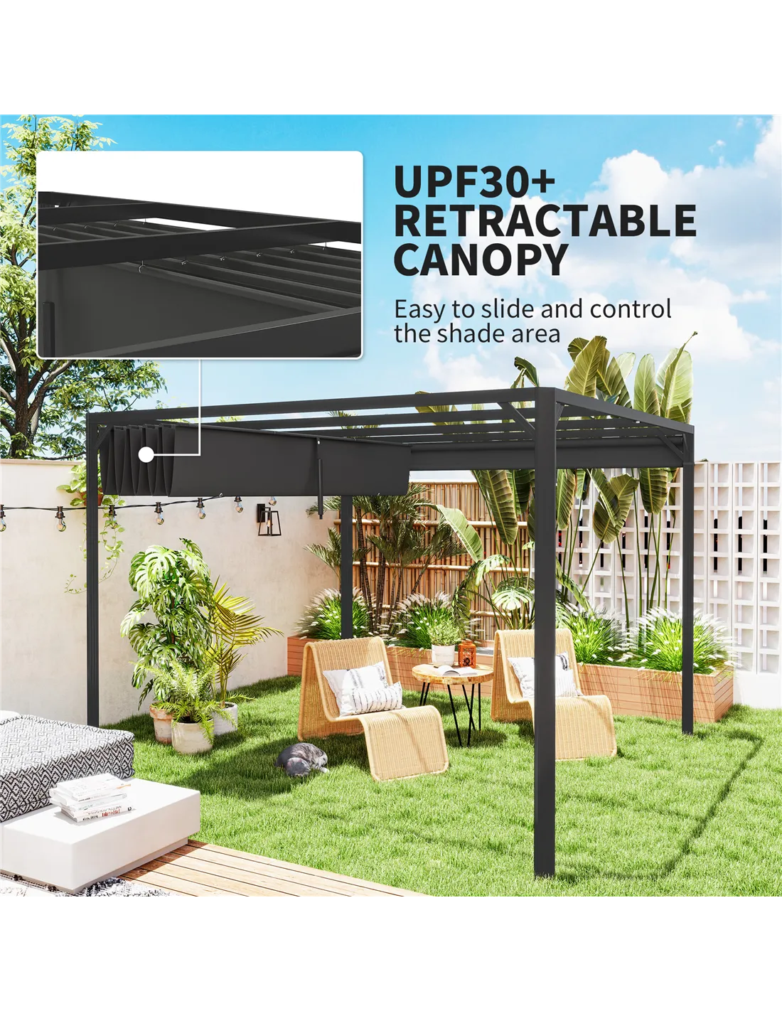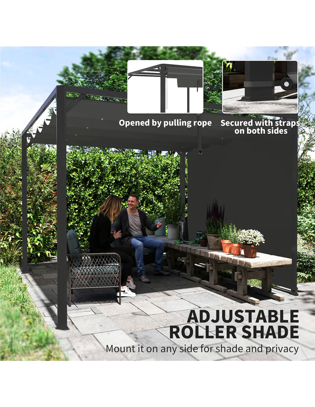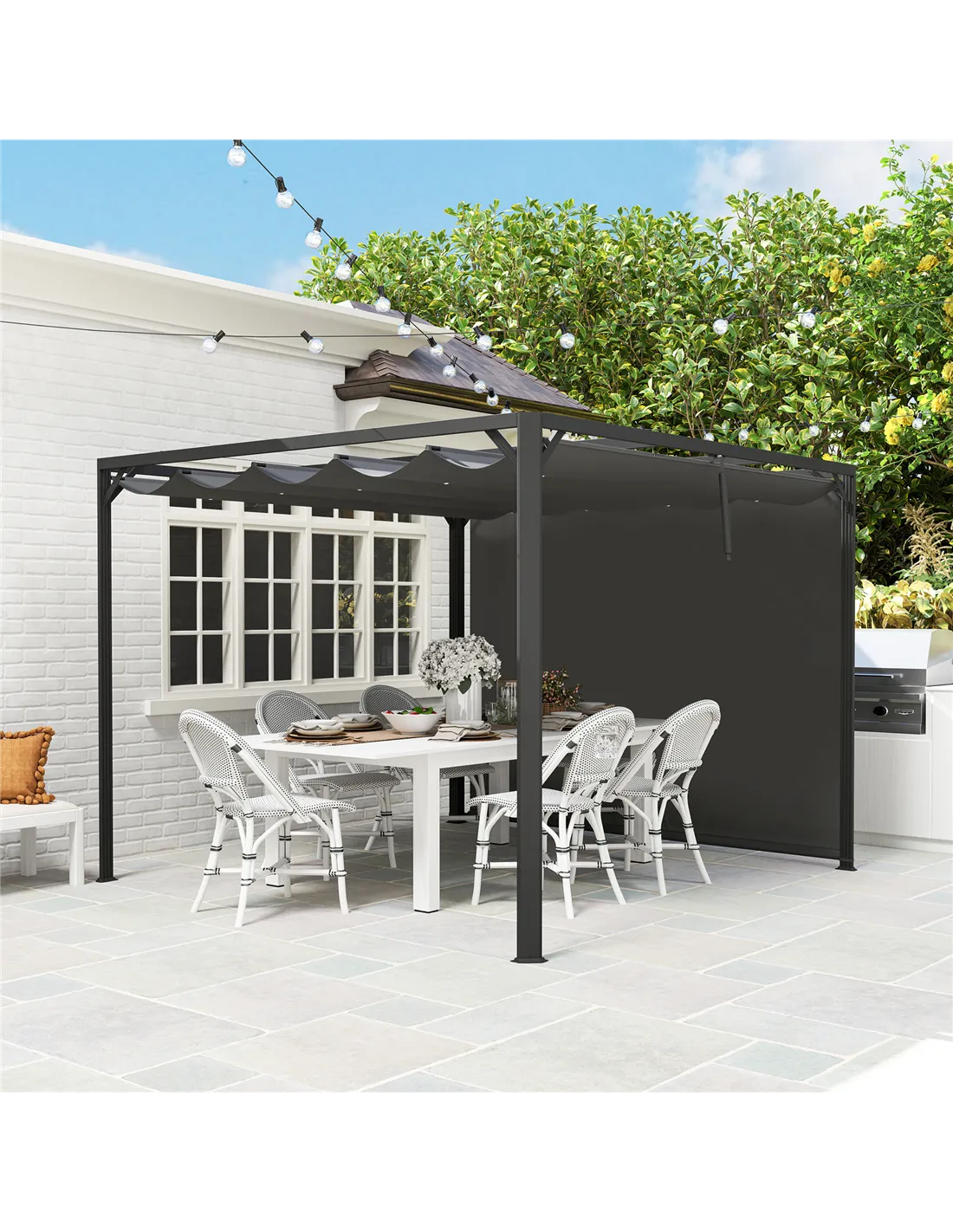 - Use the retractable canopy and roll-up side wall to adjust shade and privacy, perfect for alfresco dining, relaxing with family, or hosting garden parties throughout the seasons.