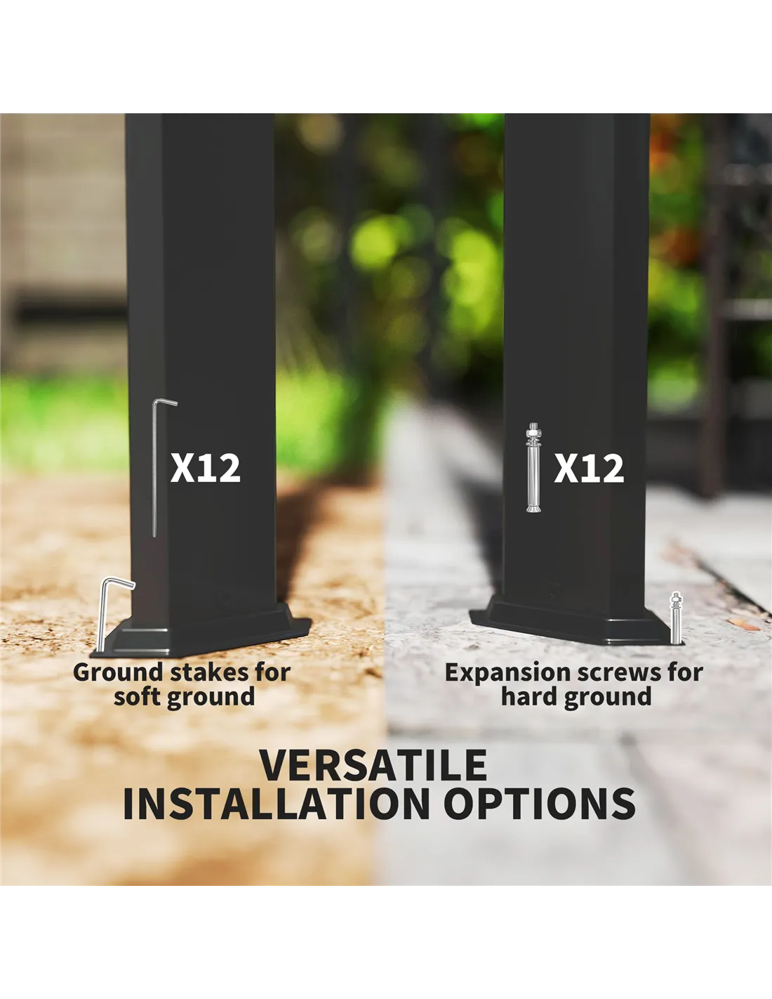 - 12x ground stakes and 12x expansion screws included to mount to the ground