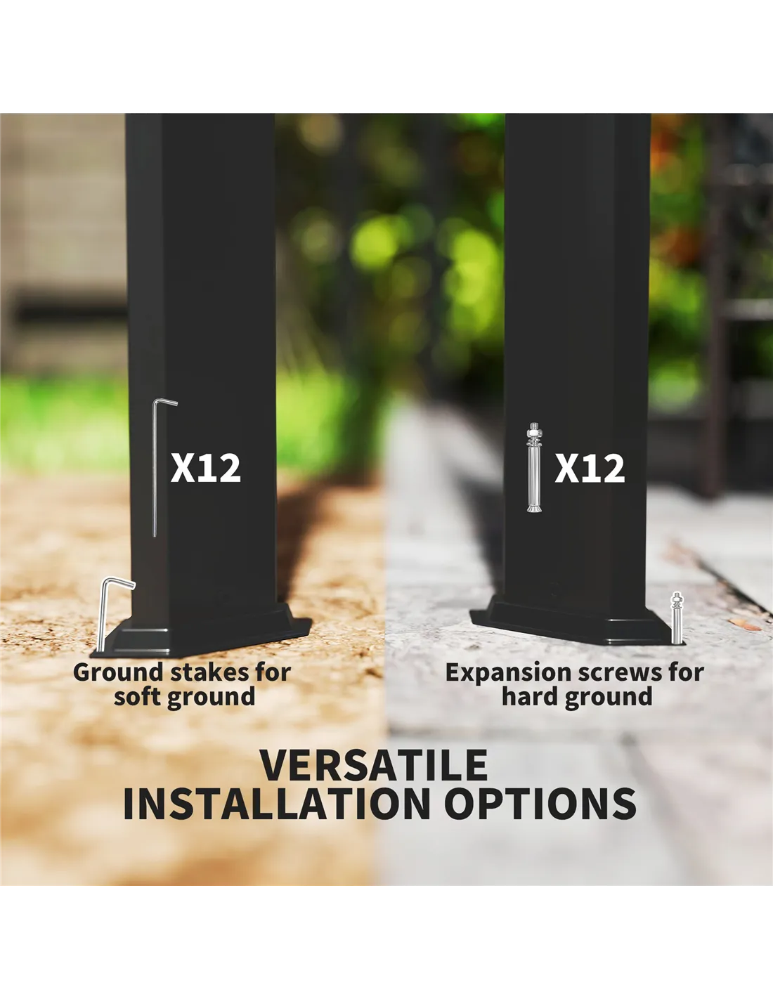 - Includes 12 ground stakes and 12 expansion screws for secure installation