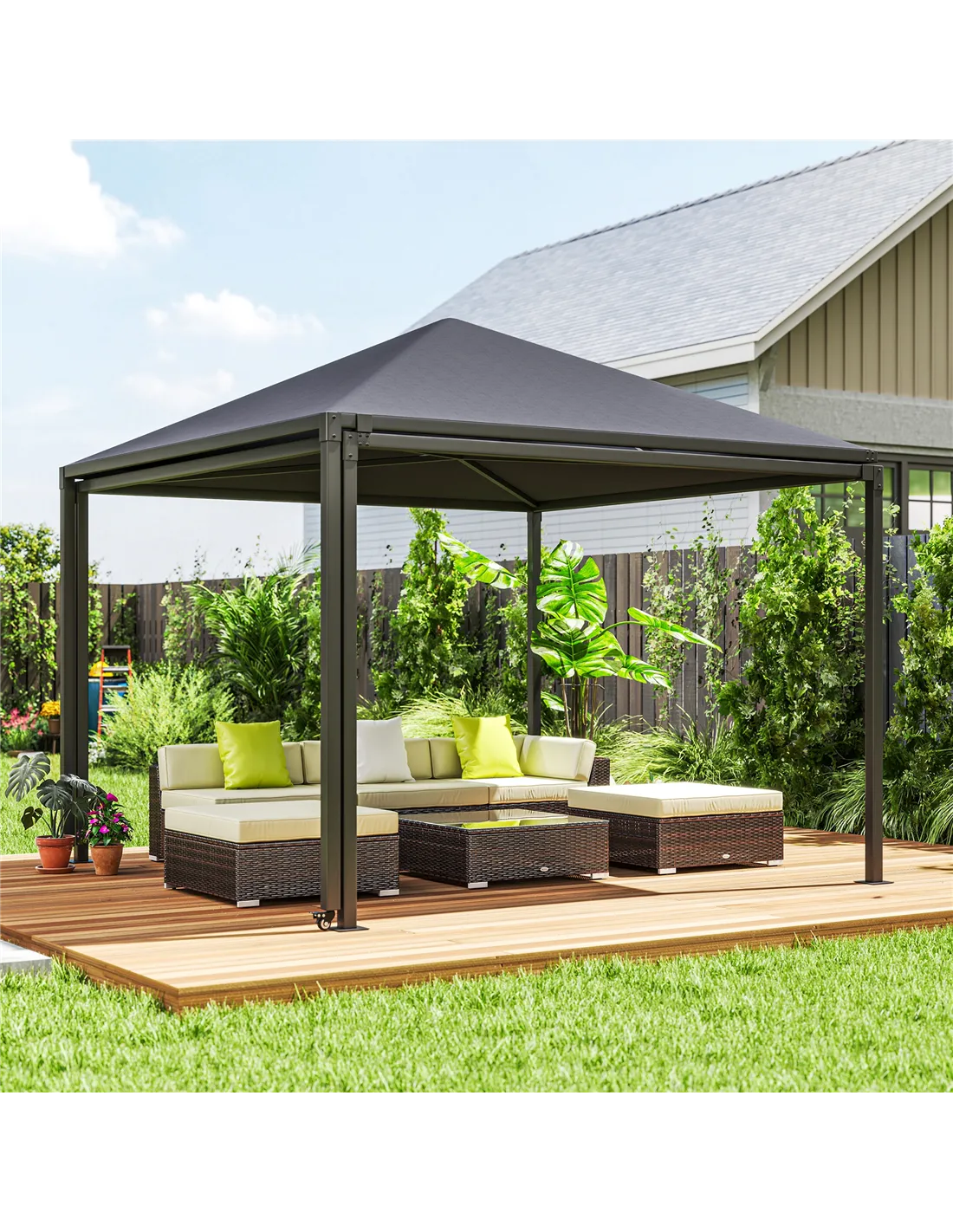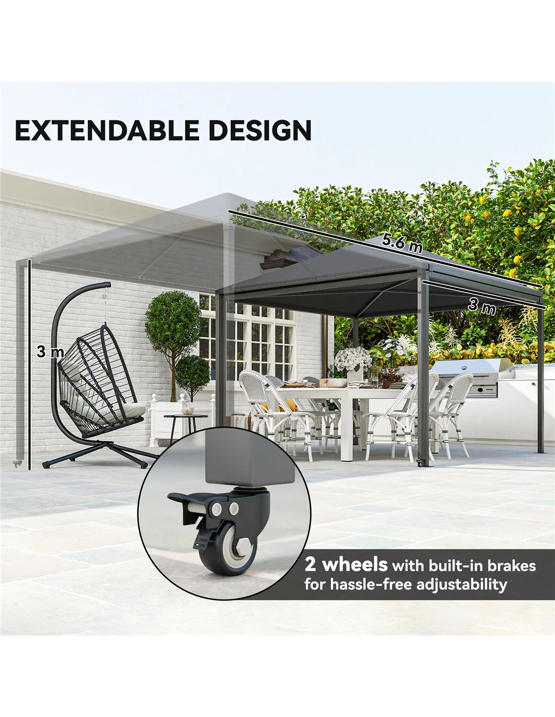- Ideal as a flexible cover for hot tubs or outdoor dining areas, thanks to its extendable awning that adjusts from 3 x 3m to 3 x 6m.