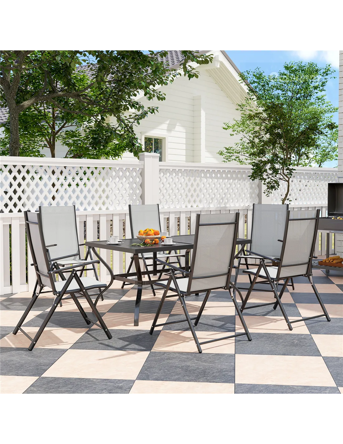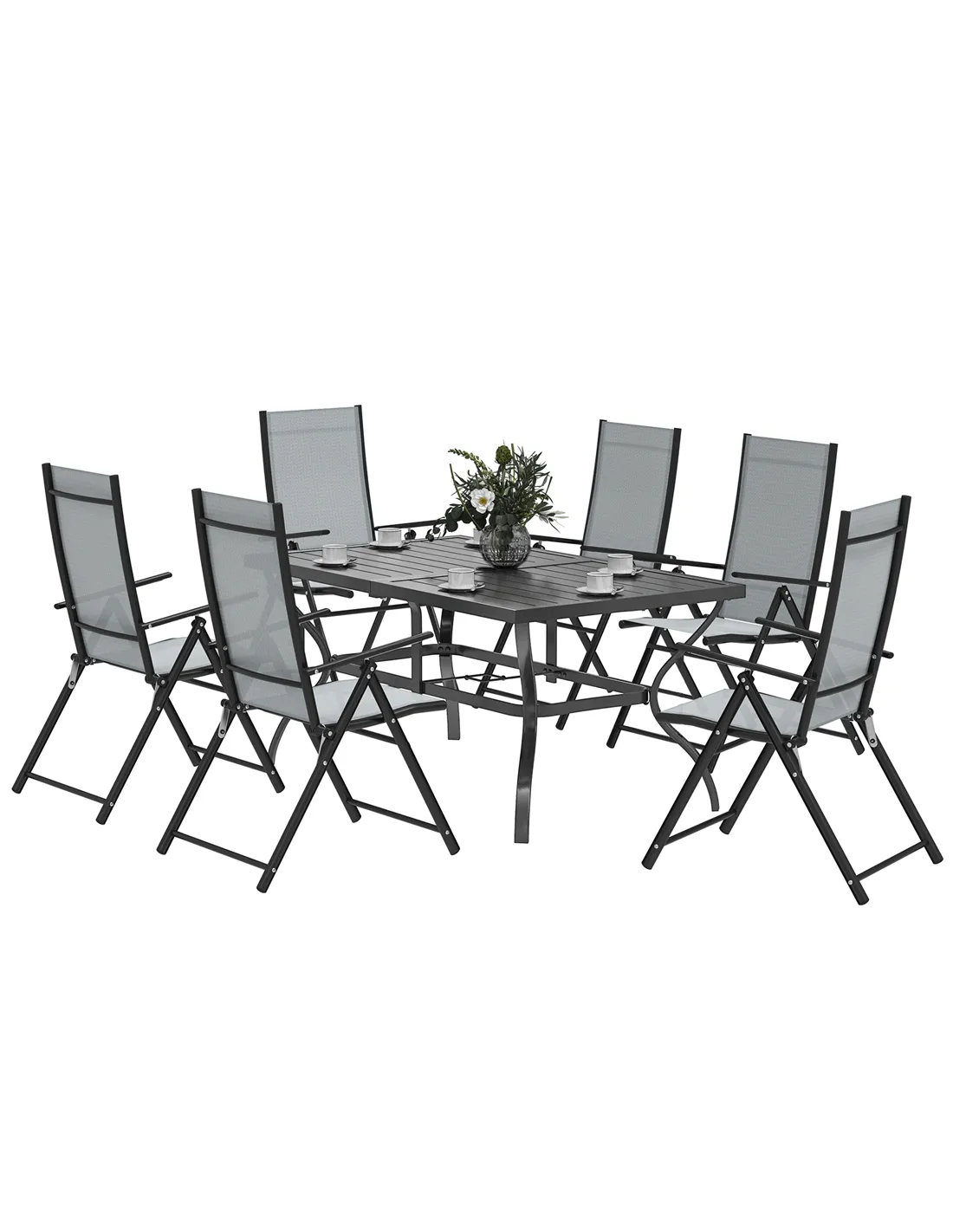 - Patio furniture set comes with a rectangular dining table and six matching folding chairs