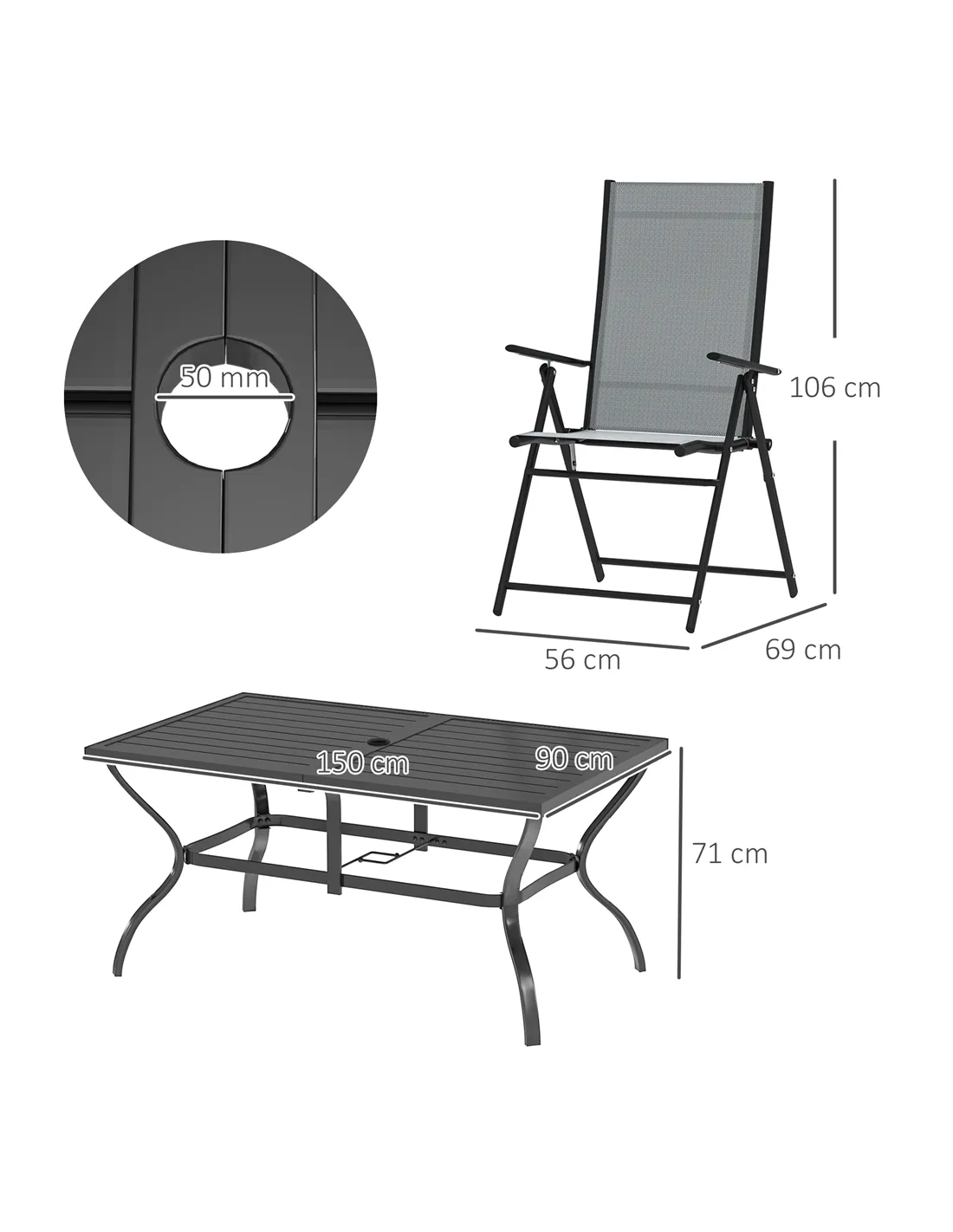 - Parasol Hole Size: Φ50mm (for Φ38-Φ48mm poles)