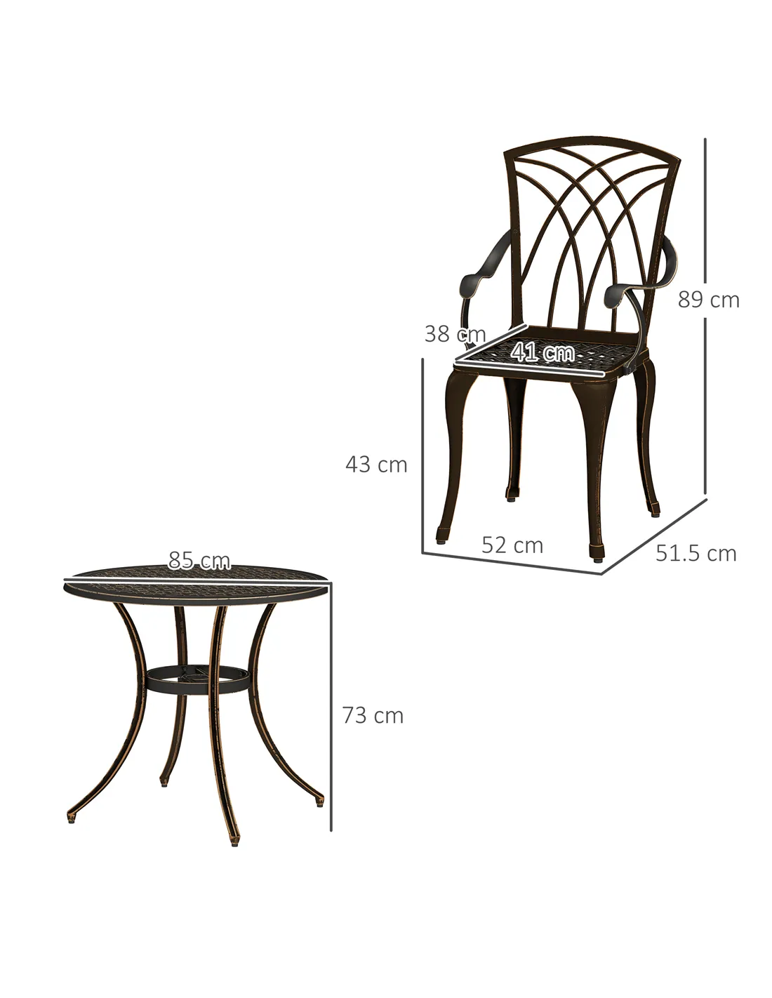 The Outsunny 5-piece garden dining set is perfect for creating a cosy outdoor dining area on balconies, patios, or small gardens. Its compact design and durable cast aluminium frame make it ideal for urban flats or countryside cottages alike. Use the round table with its parasol hole to enjoy sunny afternoons without glare, while the comfortable armchairs provide a relaxing spot for morning coffee or evening meals. This set also suits alfresco entertaining, casual family gatherings, or quiet reading sessions outdoors. Thanks to its bronze tone finish, it complements a variety of garden styles, from modern minimalism to classic British outdoor décor.