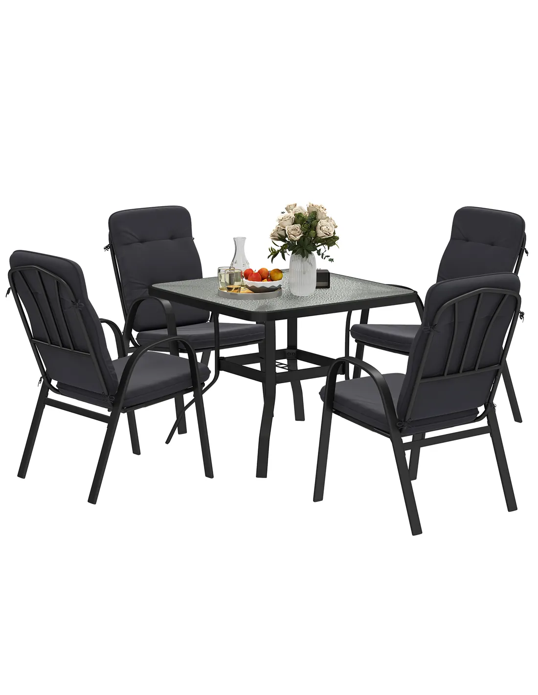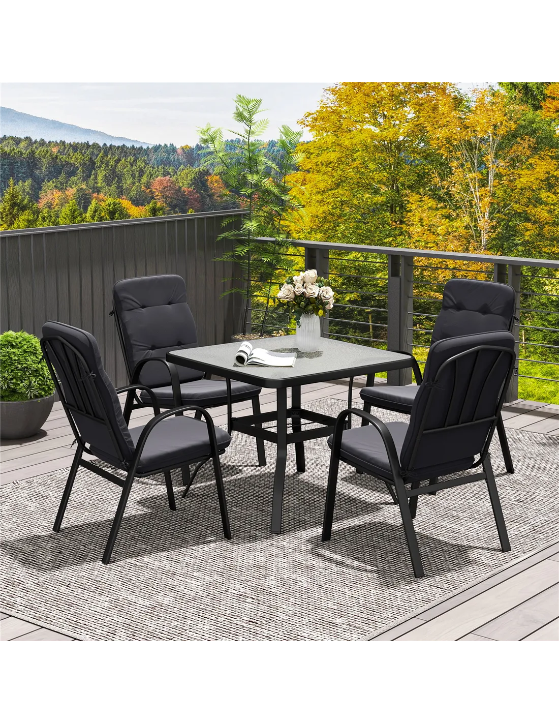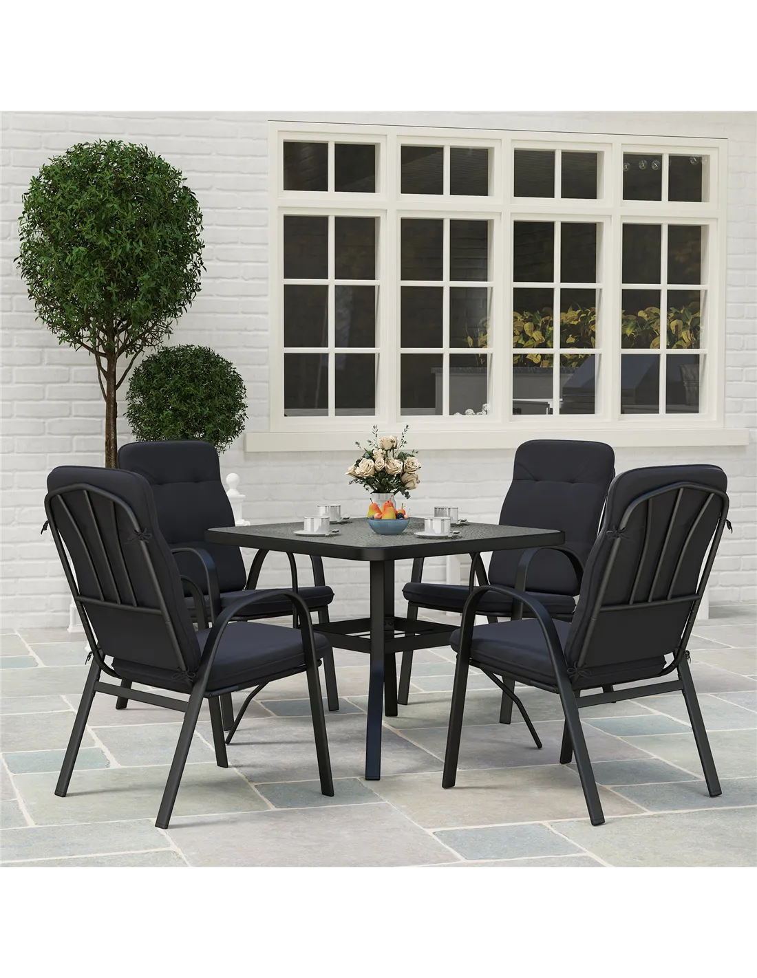 Outsunny 5 Pieces Outdoor Square Garden Dining Set w/ Tempered Glass Dining Table 4 Cushioned Armchairs, Umbrella Hole, Black