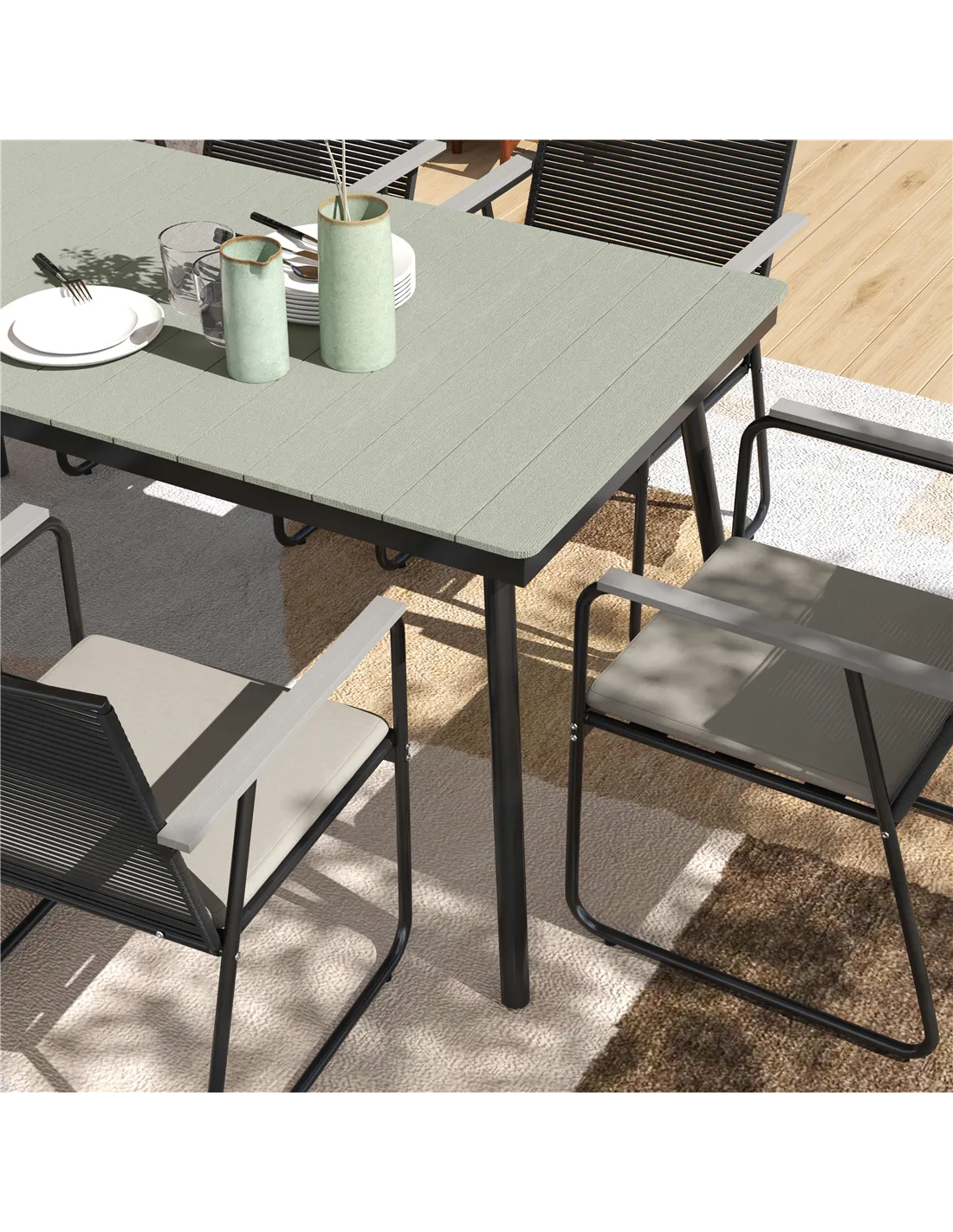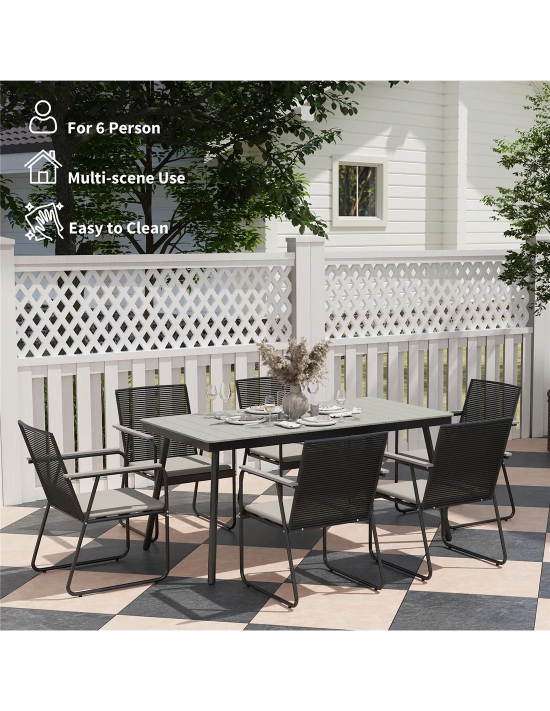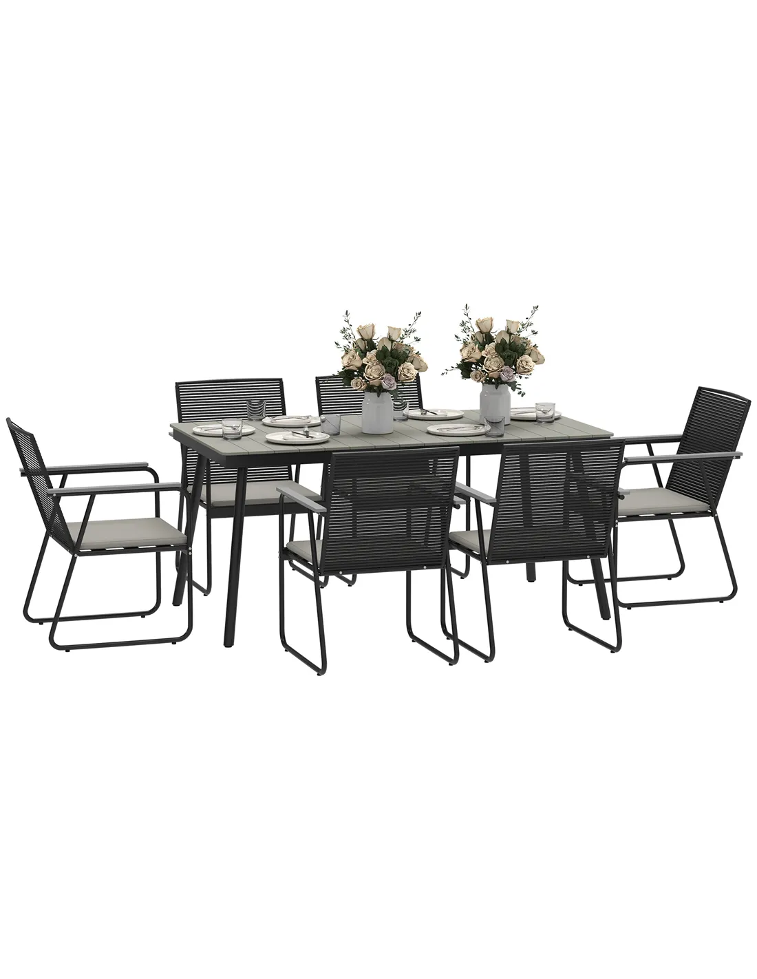 Transform your outdoor space with this stylish Outsunny 6 seater garden table and chairs! Each chair is equipped with a comfy padded cushion for hours of relaxation, while the wood plastic composite tabletop resists weather damage, ensuring durability. Suit for al fresco dining, it combines comfort, practicality and modern elegance, making every meal an unforgettable outdoor experience.