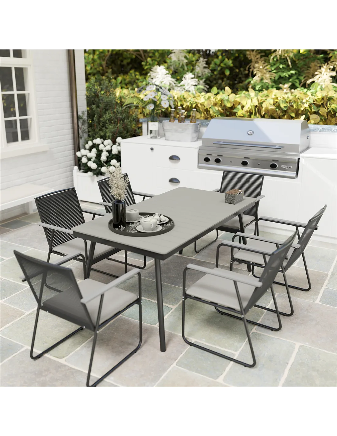 - Outdoor dining set includes six chairs and a rectangular table
