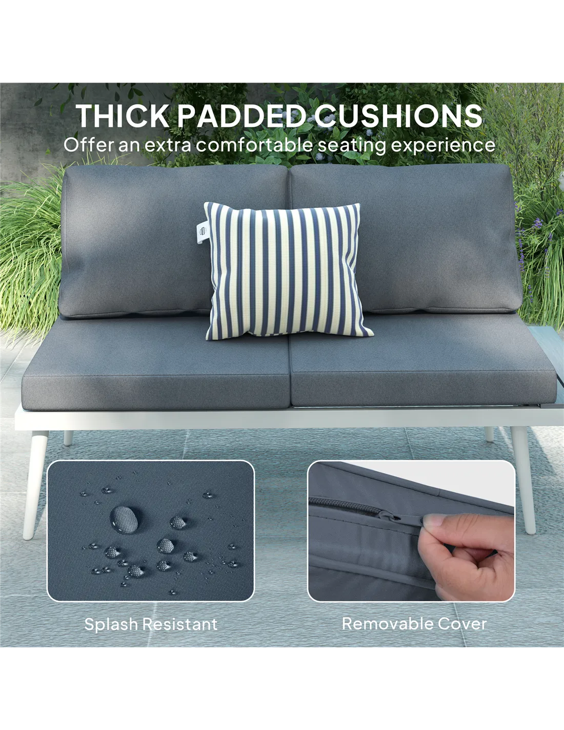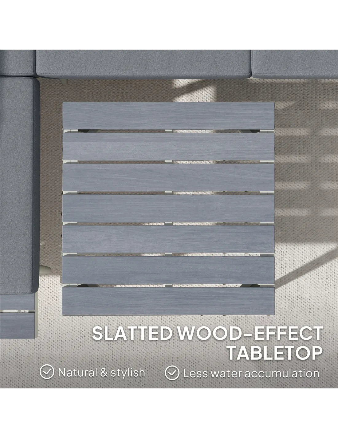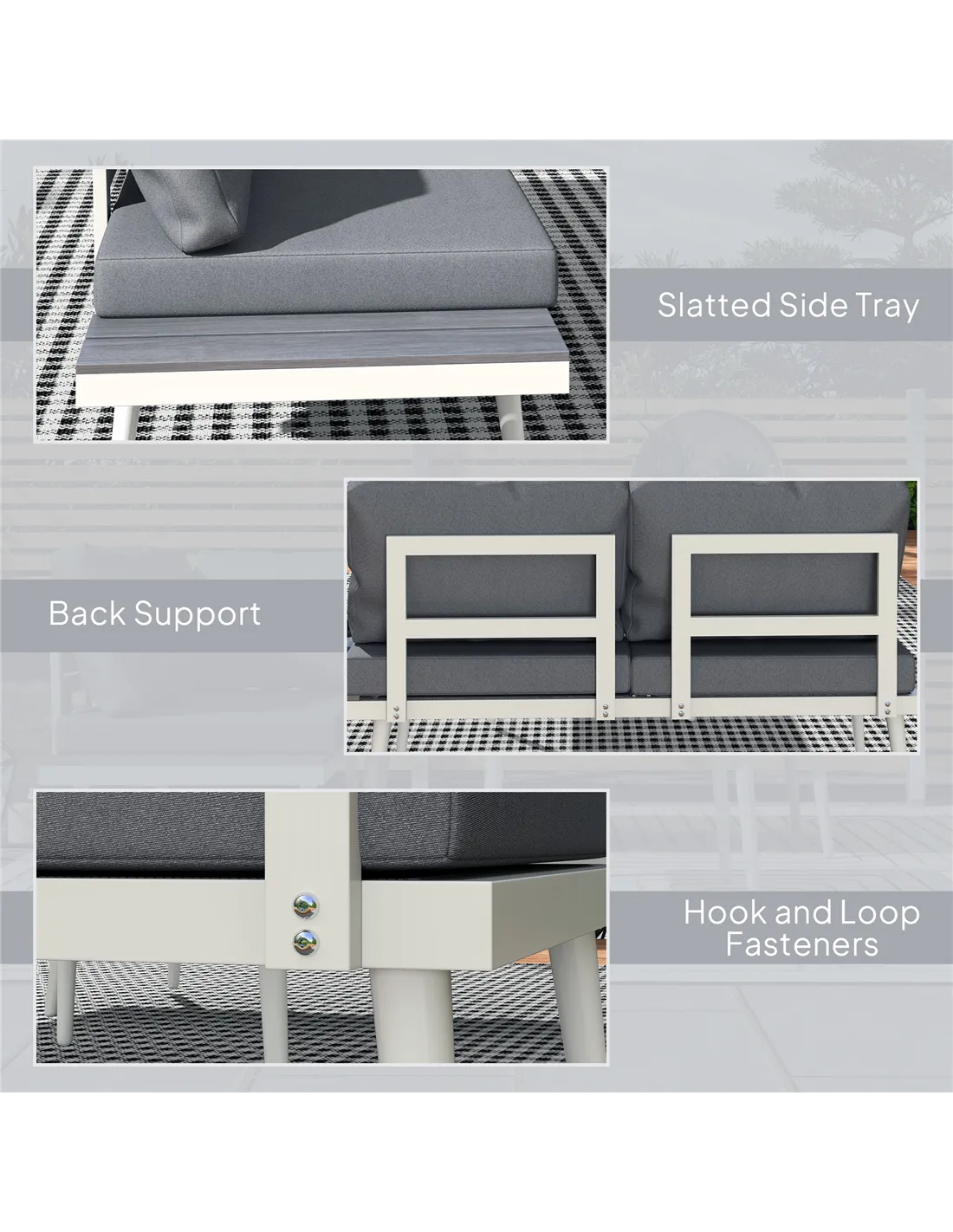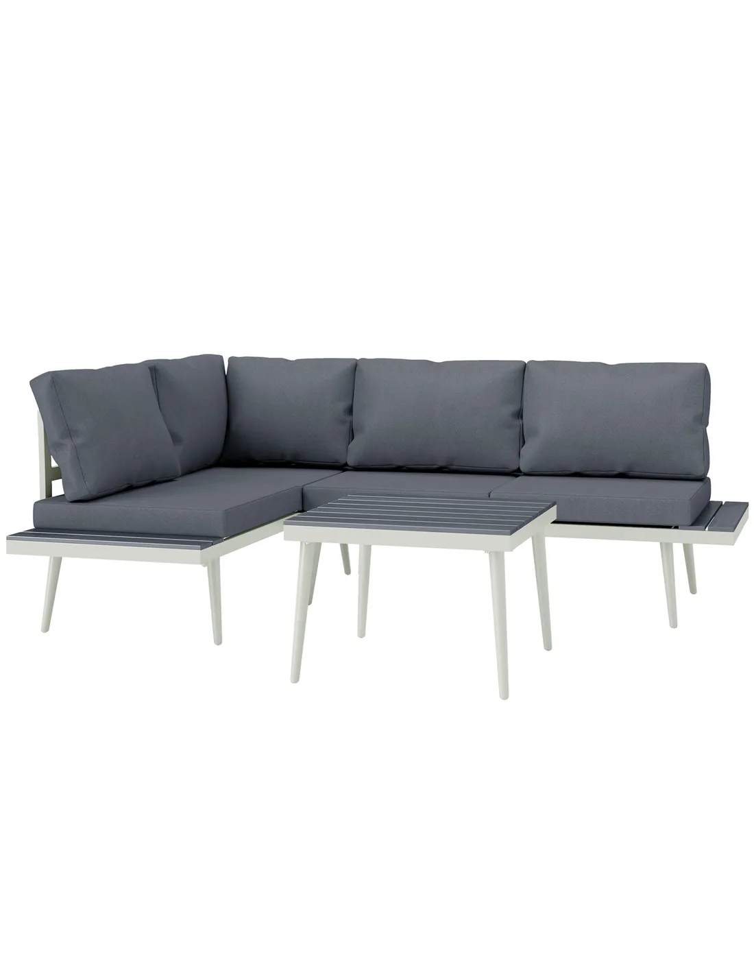 Simple and sleek, finished with total comfort - this Outsunny corner garden furniture set ticks all the right boxes. The conservatory furniture set comes with three pieces: two loveseats and a square table. Revel in adjustable comfort with the five-position seat. Steel frames mean a strong core. Thick padded cushions and texteline seats of this balcony furniture set allow you to relax comfortably. Slatted wood-effect tabletop and side trays add a stylish and functional touch.