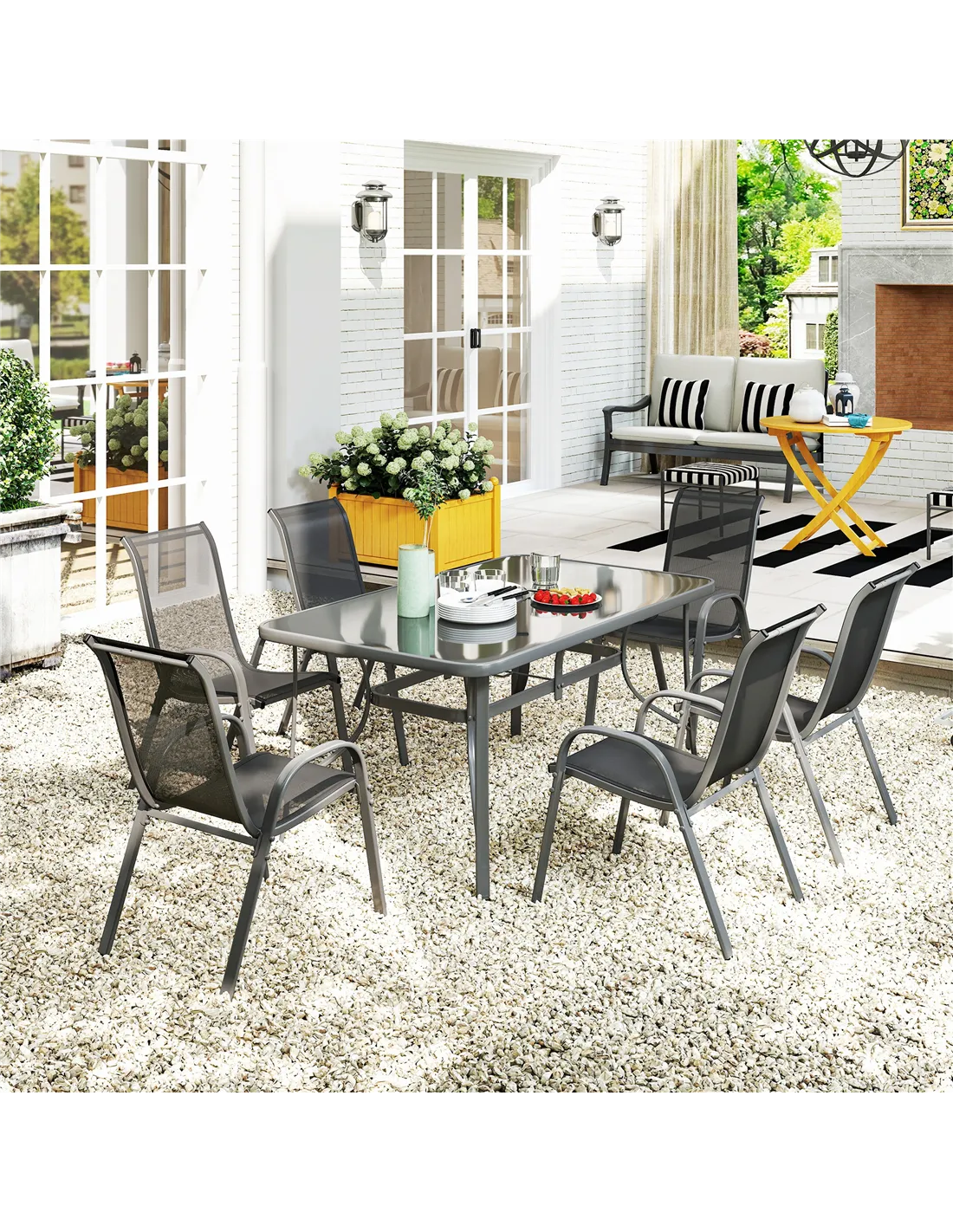 Check out this Outsunny outdoor dining set to complete your space. The set includes six garden dining chairs and a round glass-top table with an umbrella hole - you've got everything you need to dine with family/friends and keep protected. The metal frames of each piece are strong and rust-resistant, with the breathable mesh chairs making them suitable for hotter climes. An excellent addition to your outdoor areas all year round.