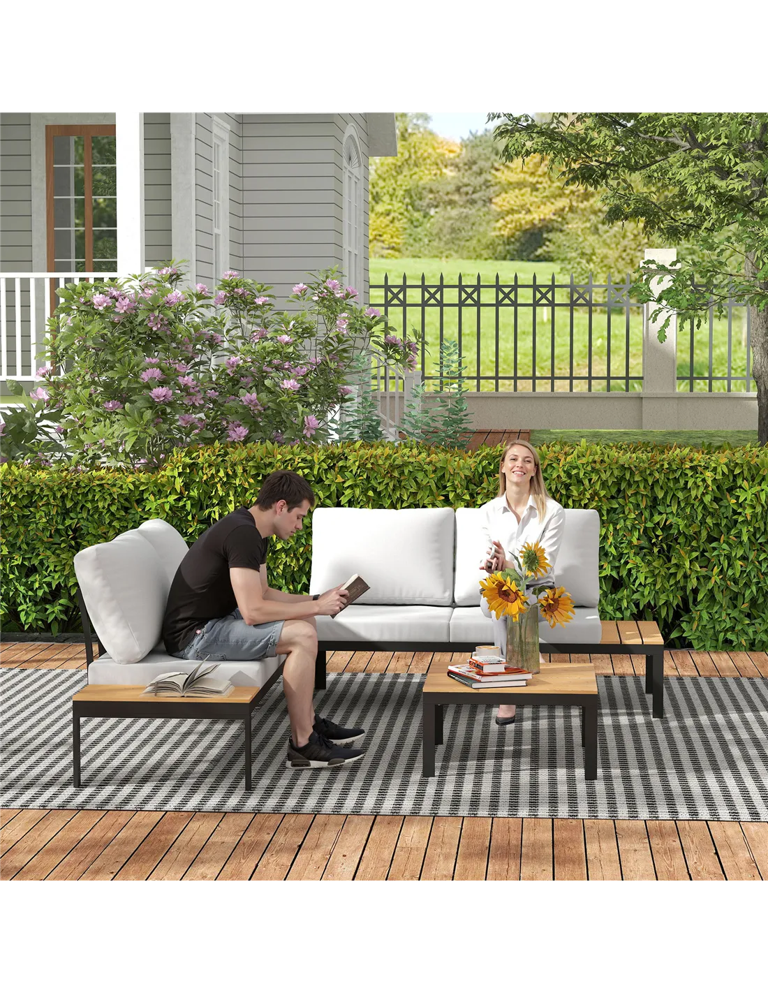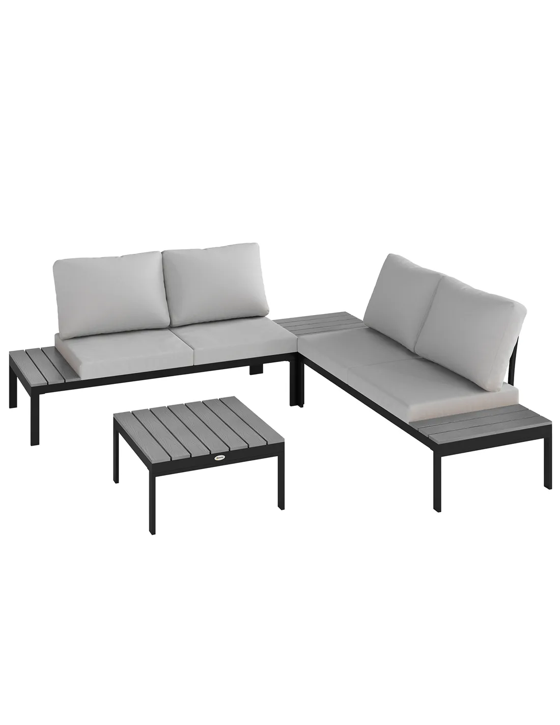 Transform your garden into a haven of relaxation with the corner garden furniture set from Outsunny. This versatile balcony furniture set includes two loveseats and two coffee tables, allowing you to configure them in L-shaped or straight, combination or separation for different outdoor gatherings. Enjoy comfort with soft, easy-clean cushions, strong support with metal frame and stylish convenience with the slatted tabletops. Great for any garden, balcony, or conservatory.
