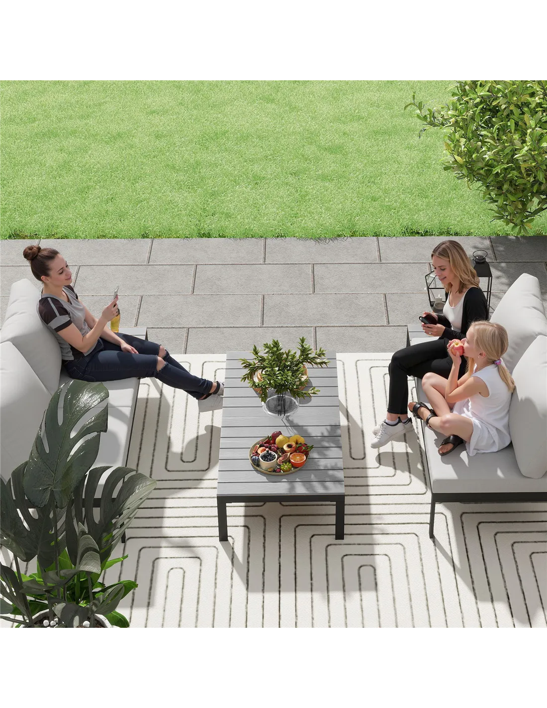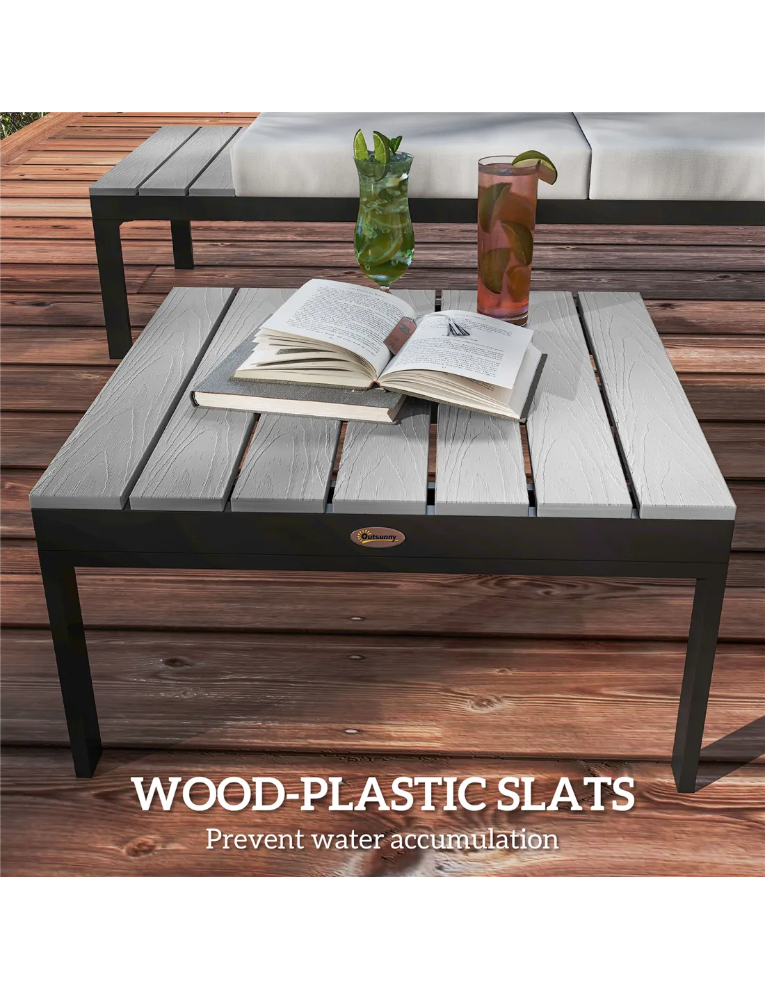 - Wood-plastic slatted tabletops prevent water accumulation, ensuring longevity