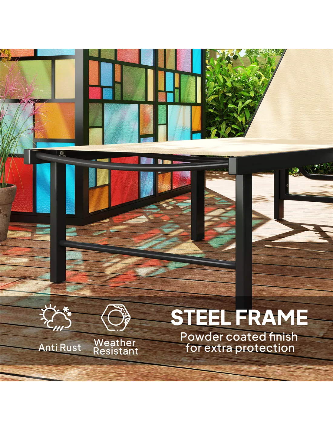 Yes, the powder-coated steel frame and weather-resistant texteline fabric make them durable for outdoor conditions, though storing them indoors during harsh winter months is recommended to prolong lifespan. - How much weight can each sun lounger support?