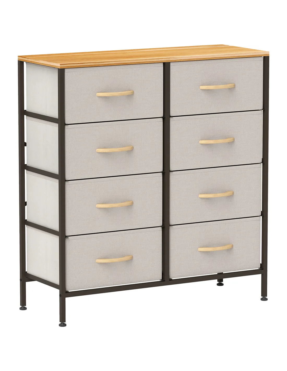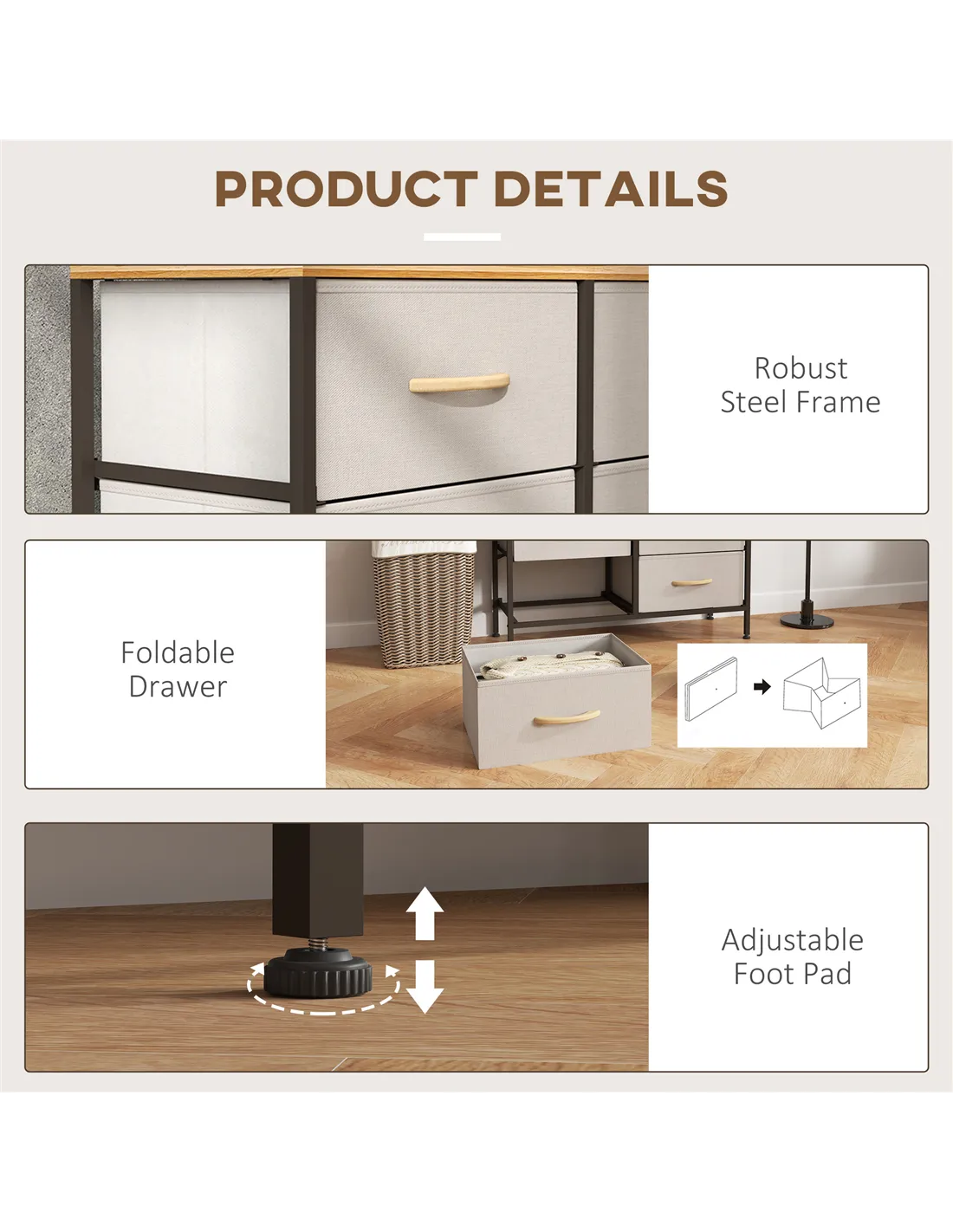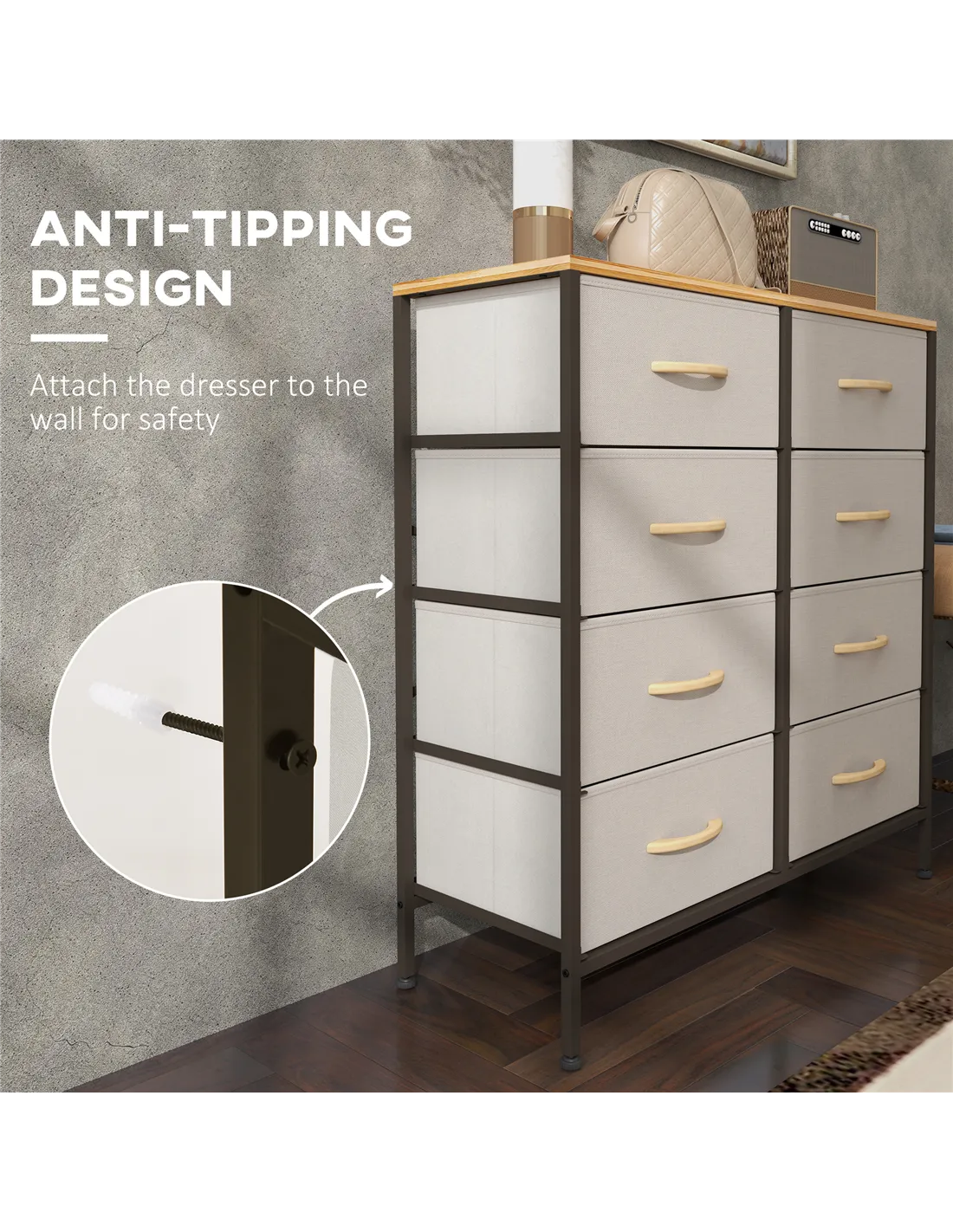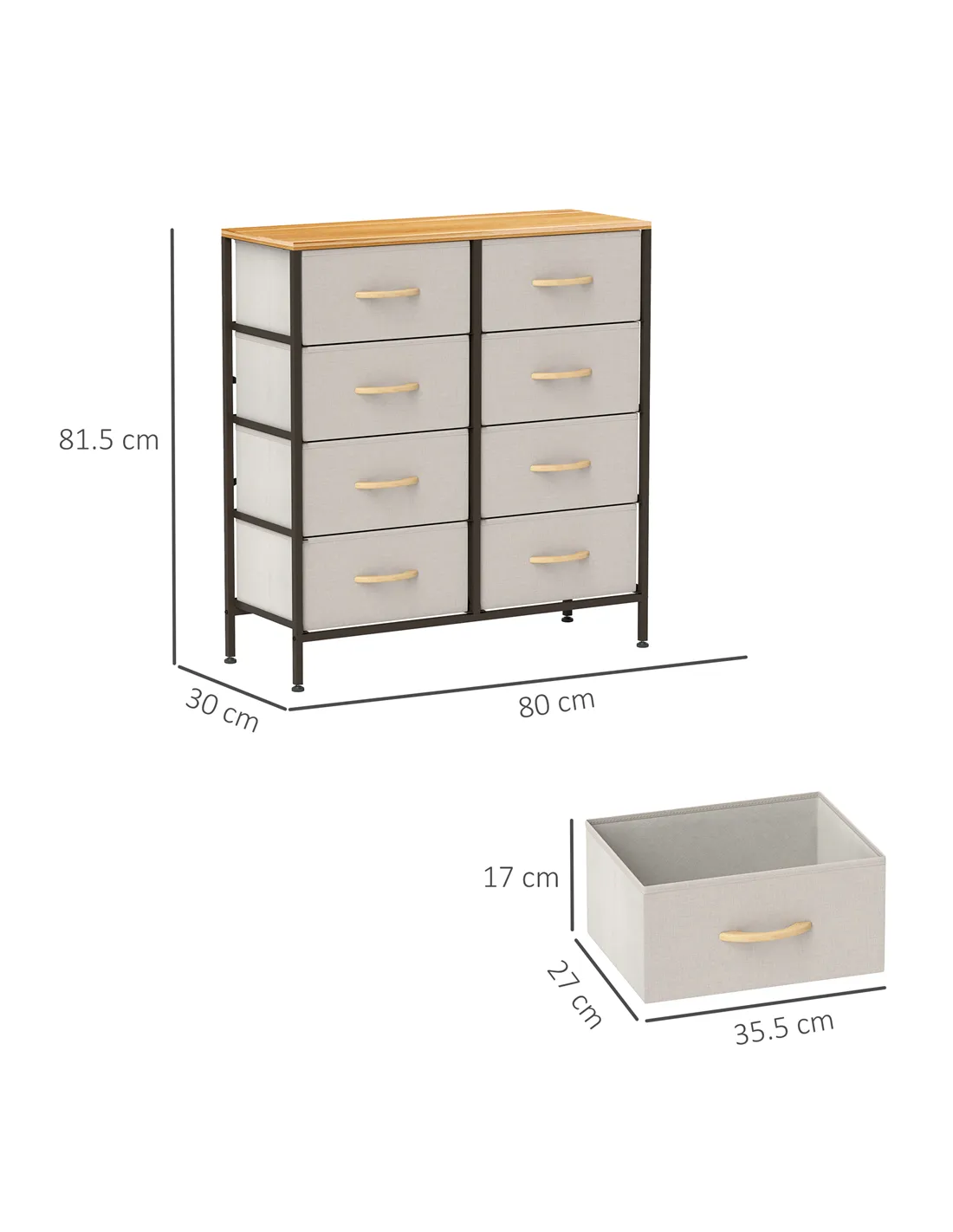 Home storage with this HOMCOM fabric chest of drawers. The eight fabric drawers offer room for lots of things - keep t-shirts, tops, bottoms and more organised. The wood-effect top offers more room: a great place to display your favourite photos. The steel frame makes a strong core, with adjustable feet for balance. Comes with anti-tipping straps for safety. Use all over the home and office.