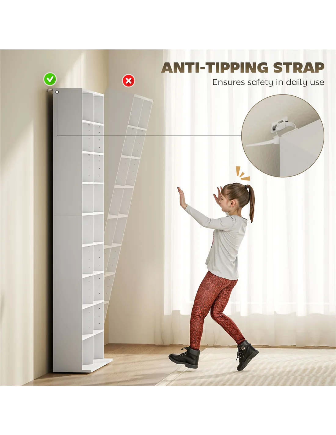 - Anti-tip straps provide added safety, making it suitable for family homes with children or pets.