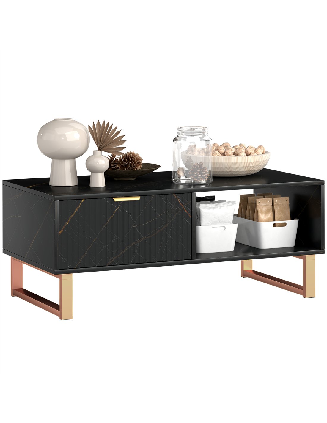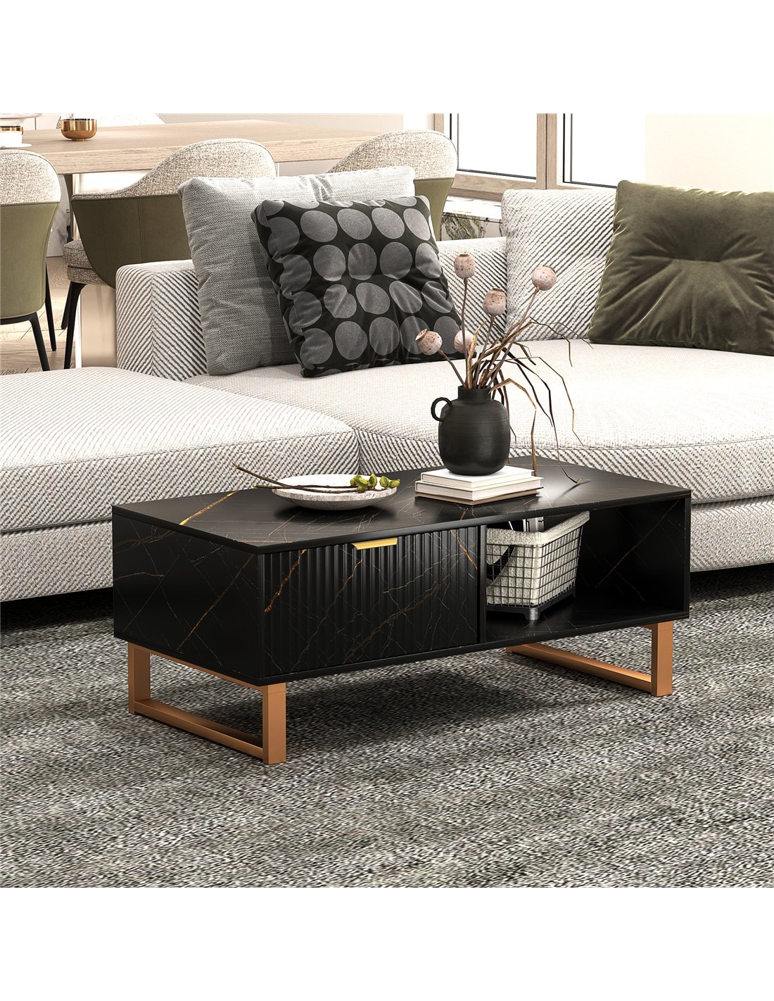 Thanks to the marble-inspired design of this HOMCOM living room coffee table, paired with the gold tone accents, this is an elegant piece for your living space. The modern coffee table has a drawer and large shelf, with a smaller shelf on the other side; complete with steel legs for lots of support.