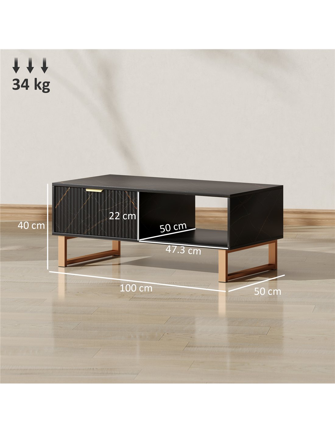 The HOMCOM marble effect coffee table is a versatile addition to any modern living room or lounge area. Its sleek black finish with gold-tone accents complements a variety of interior styles, from contemporary to classic. Use the spacious tabletop to display decorative items or serve refreshments during gatherings. The drawer and dual shelves provide practical storage for magazines, remote controls, or everyday essentials, helping to keep your space organised and clutter-free. Raised 15 cm from the floor, it allows easy cleaning underneath, ideal for busy households. This piece also works well in home offices or reception areas, adding a touch of sophistication while offering functional storage.