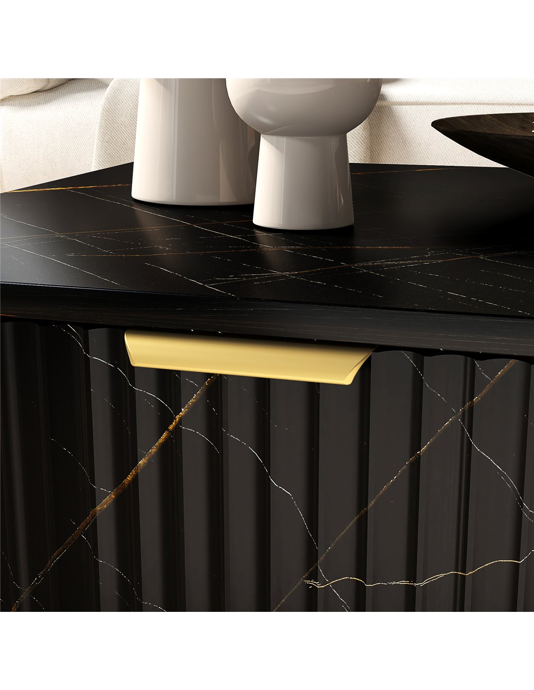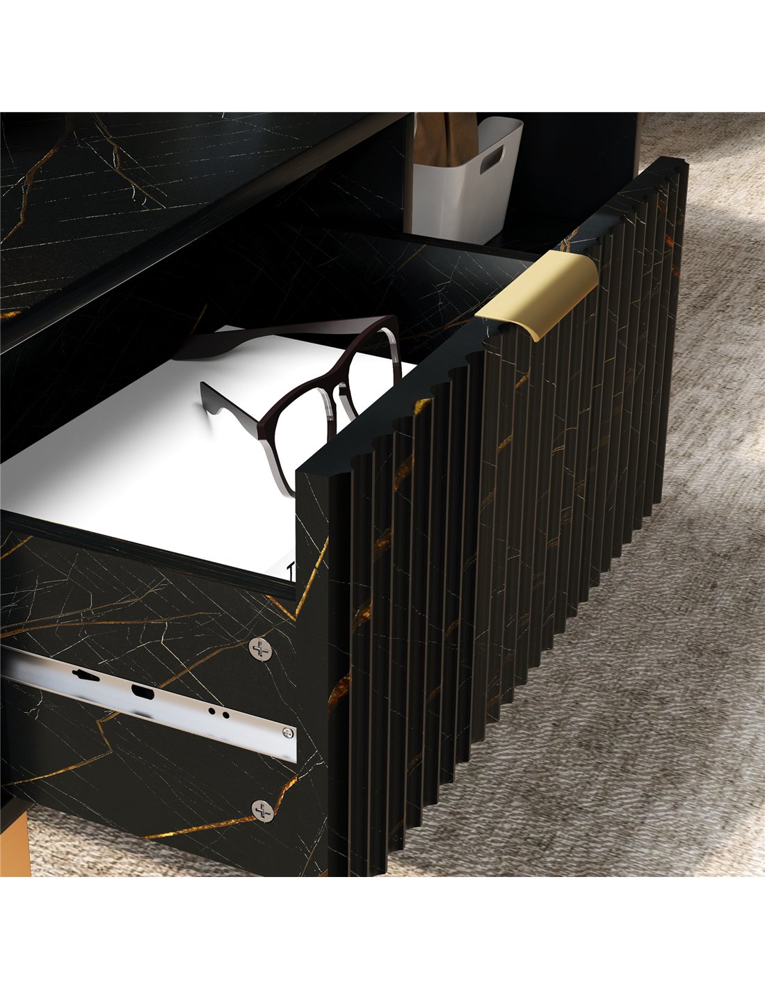 - Marble pattern, fluted drawer and gold tone accents for an elegant look
