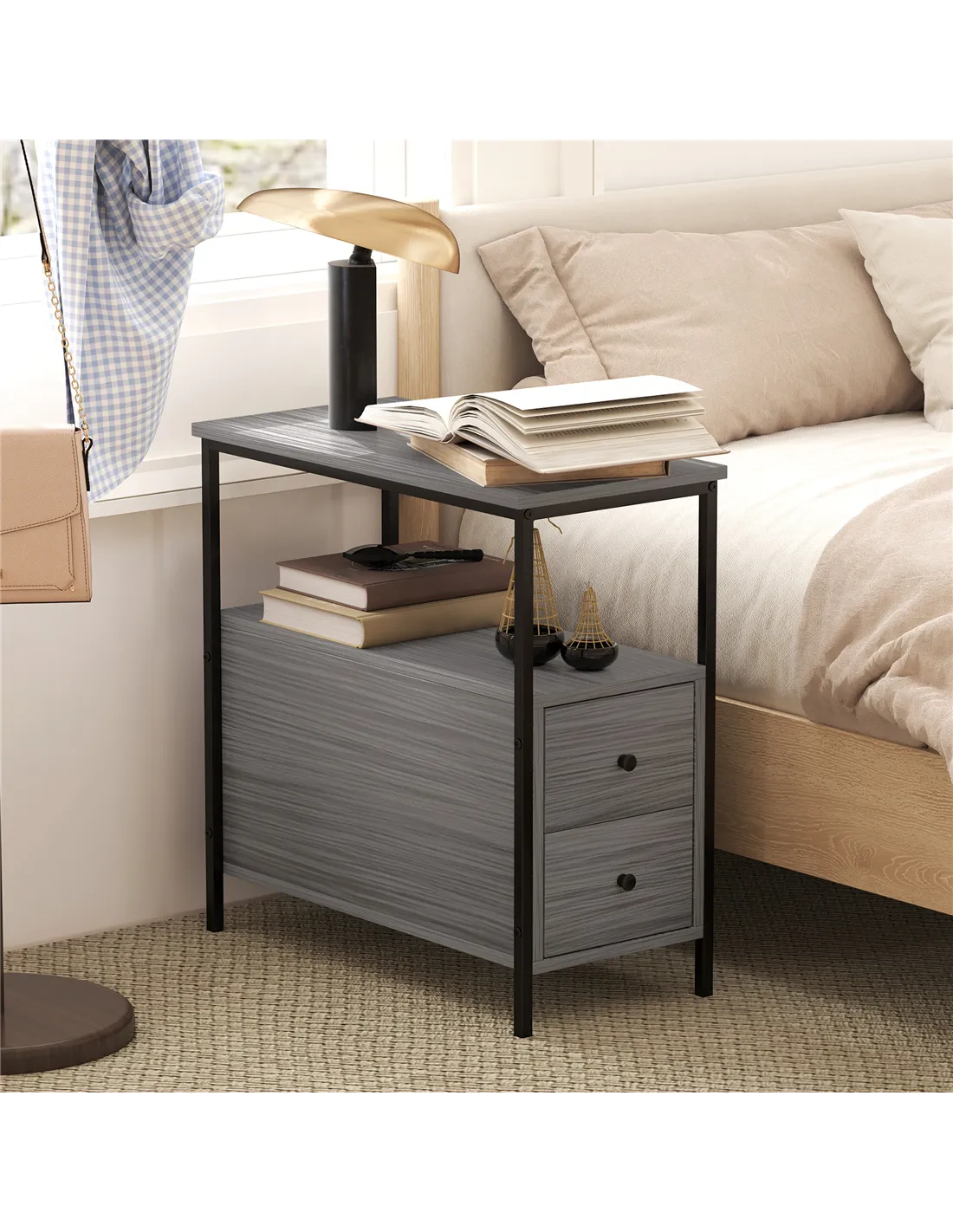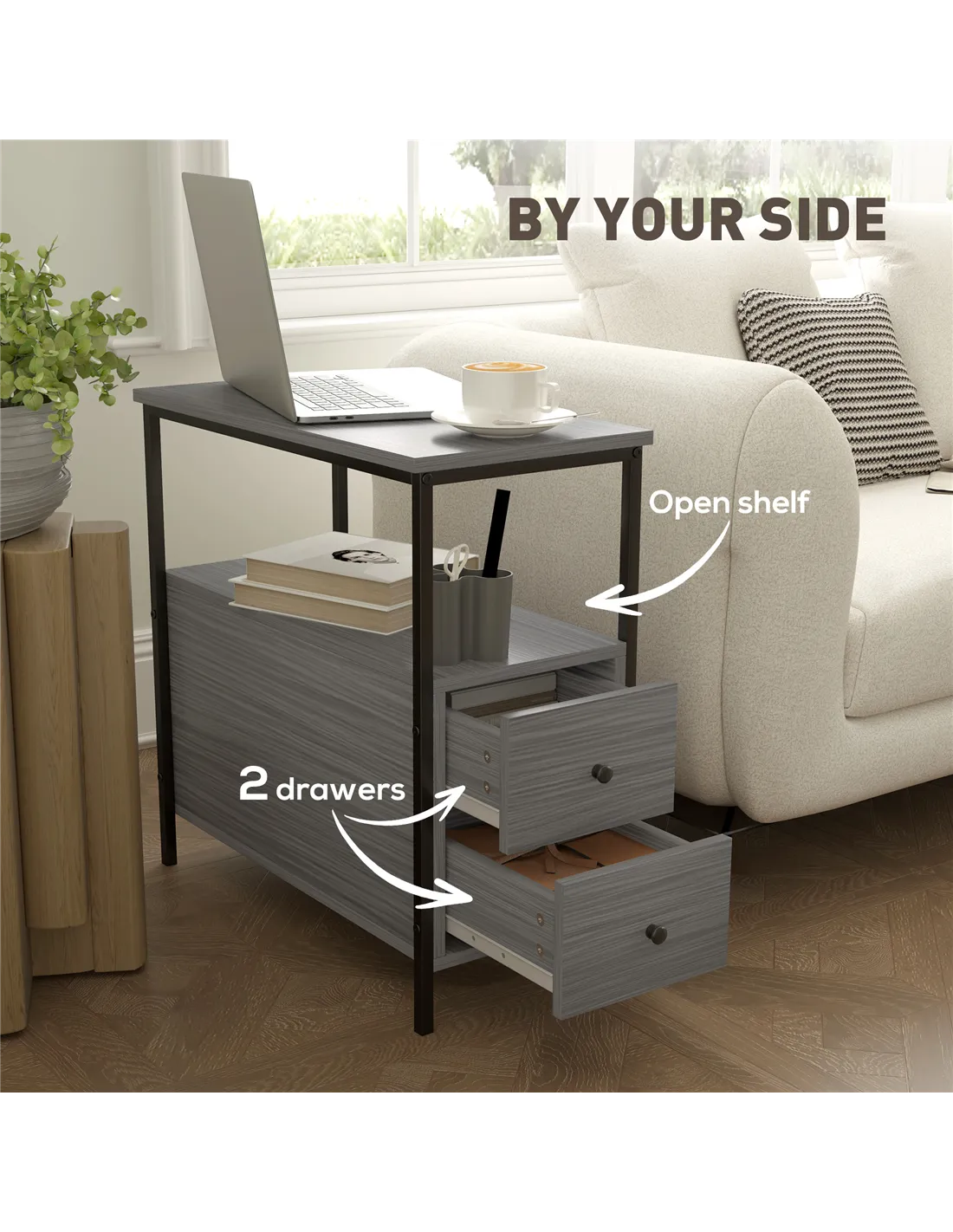 The HOMCOM narrow bedside table is a versatile addition to any home, perfectly suited for compact spaces. Ideal as a bedside companion, it offers convenient storage for books, lamps, or nighttime essentials. In the living room, it functions well as an industrial-style sofa side table, providing space for remotes, magazines, or decorative items. Its sturdy metal frame and two drawers also make it a practical choice for a hallway or office corner, keeping clutter neatly organised. The grey wood grain finish complements modern and rustic interiors alike, enhancing your room’s aesthetic while maximising storage.