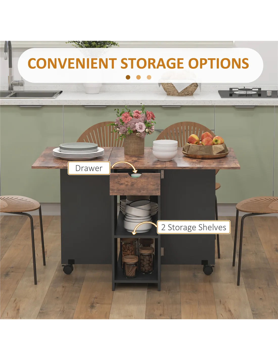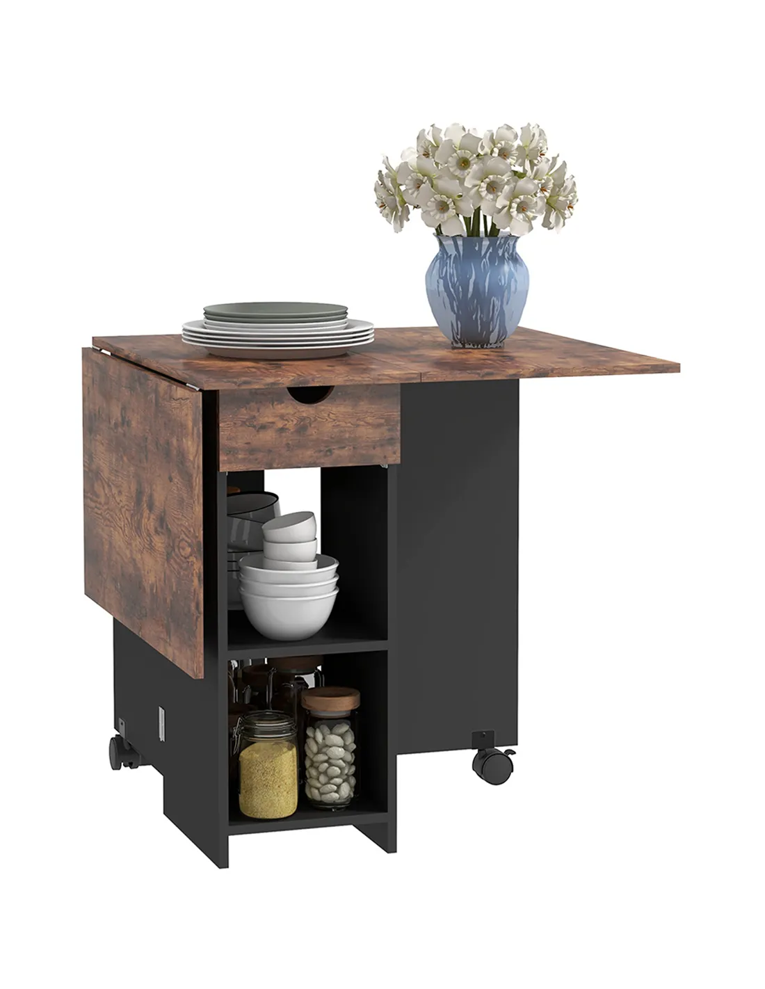 HOMCOM Folding Dining Table, Drop Leaf Table for Small Spaces, Foldable Table with Drawer and Storage Shelves for Kitchen, Dining Room, Rustic Brown