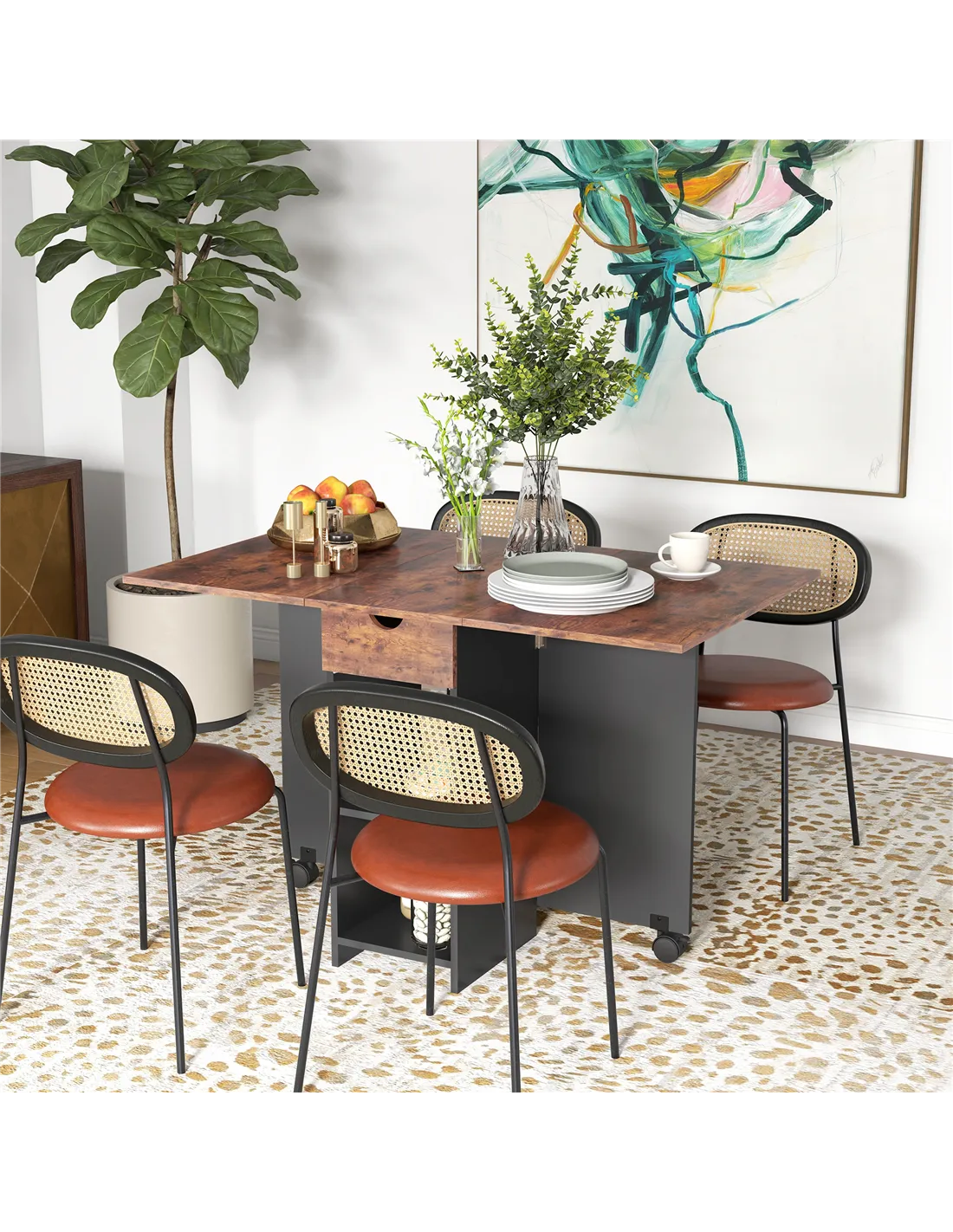 - Drop leaf design allows three setups: no leaf, a leaf, or two. Seats up to four people