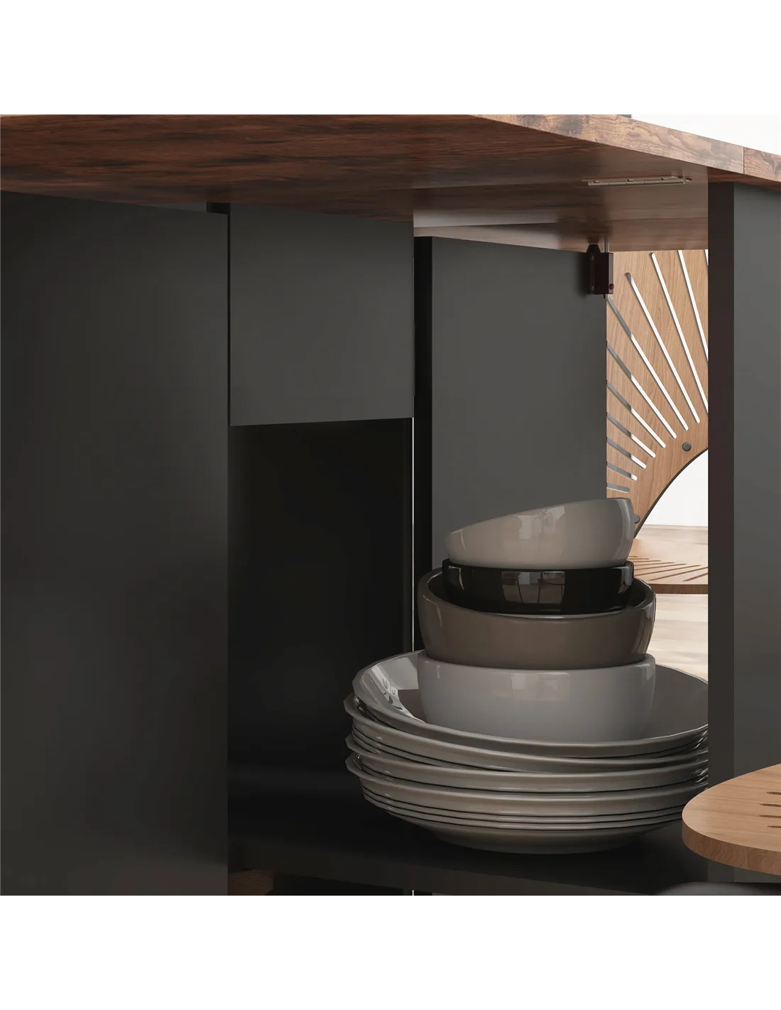 - Built-in a drawer with steel slides and two shelves: storage for tableware, utensils and other dining accessories