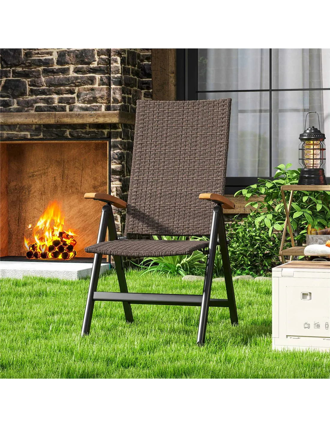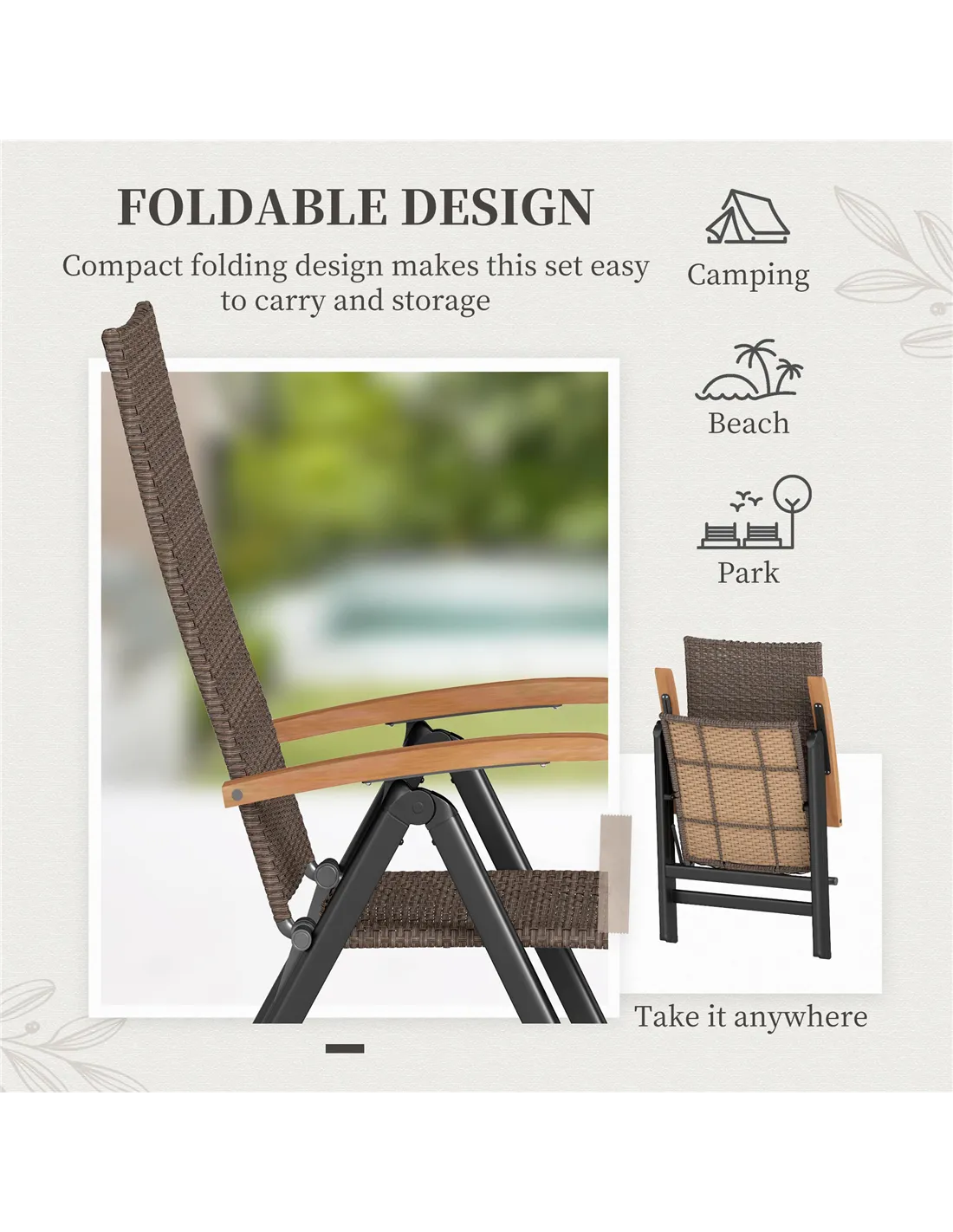 The Outsunny folding rattan garden chair is perfect for enhancing your outdoor living space with both style and comfort. Ideal for relaxing on your patio, decking, or garden, its five-level reclining backrest allows you to find the perfect position for reading, sunbathing, or enjoying a meal alfresco. Thanks to its foldable design, it’s easy to store away during the off-season or transport for picnics and camping trips. The natural wooden armrests add a touch of elegance, making it a great addition to any outdoor dining set or casual seating area. Whether hosting garden parties or enjoying quiet moments outdoors, this chair adapts effortlessly to your lifestyle.